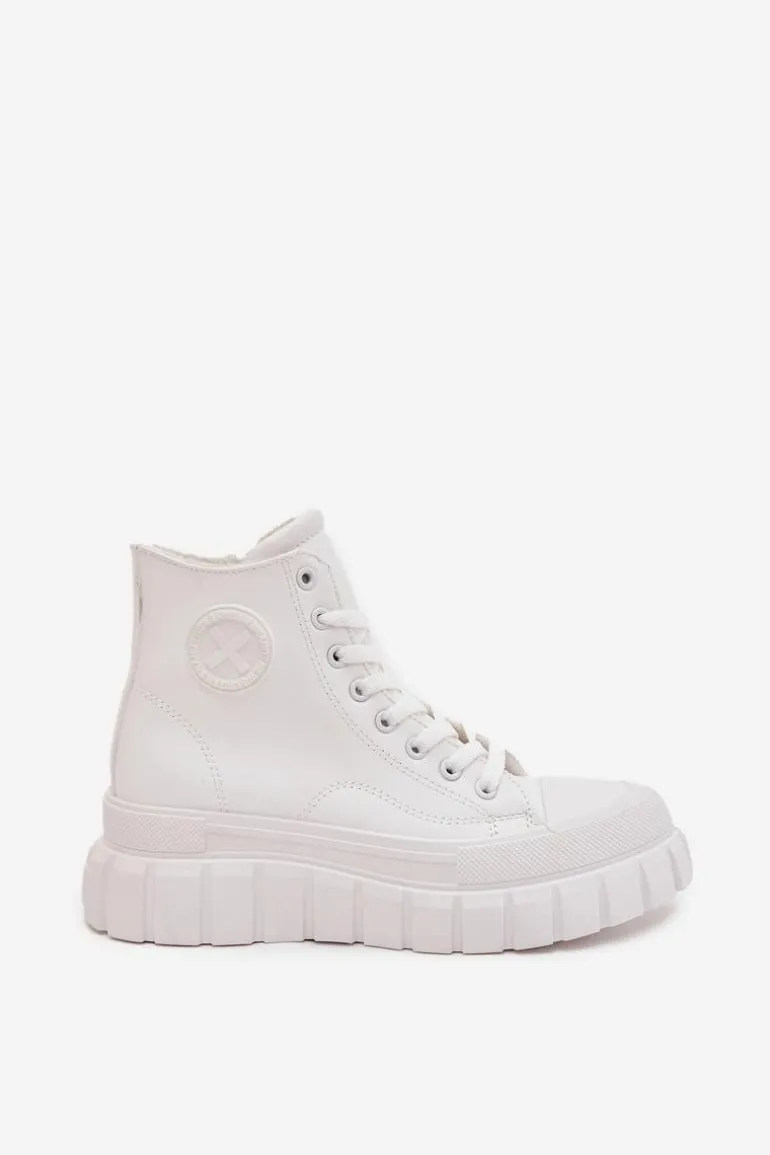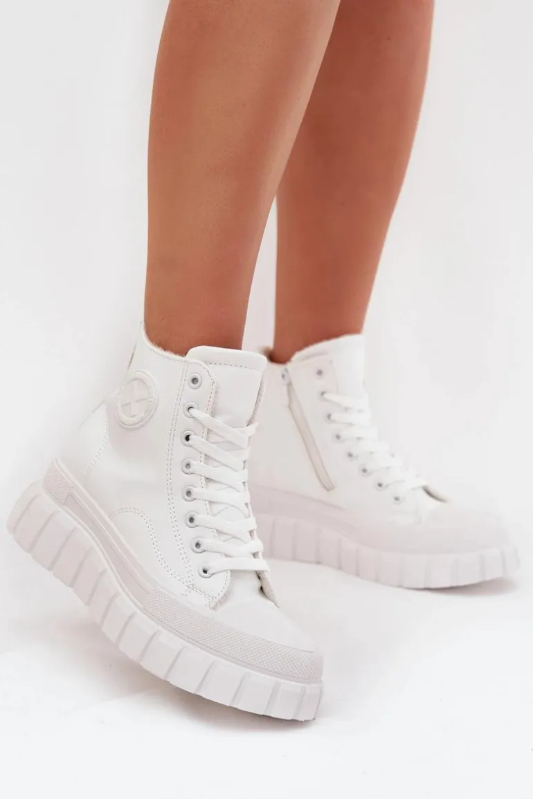 Trampki damskie wykonane ze skóry ekologicznej to połączenie stylu i komfortu. Wysoka cholewka zapinana na zamek oraz sznurowana, co zapewnia idealne dopasowanie do stopy. Buty osadzone są na platformie, co dodaje im modnego charakteru oraz zapewnia wygodę podczas chodzenia. Środek buta ocieplany jest miękkim kocem obuwniczym, co gwarantuje ciepło i komfort przez cały dzień. Zaokrąglone noski dodają trampkom lekkości i subtelności. Idealny wybór na chłodniejsze dni! Przy wyborze rozmiaru prosimy sugerować się tabelą rozmiarów.