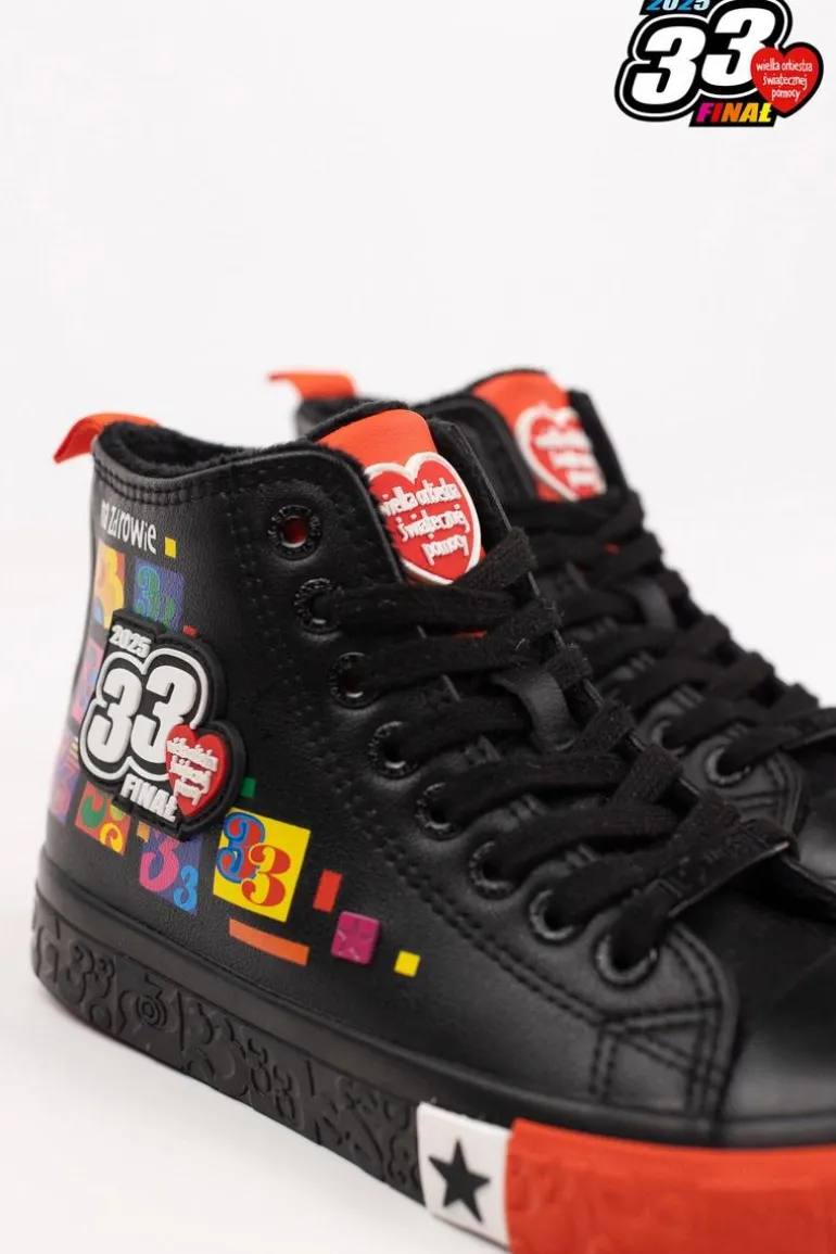 Damskie trampki Big Star Shoes zostały zaprojektowane przez zespół grafików Jurka Owsiaka. Model ten wyróżnia się czarną podeszwą wykończoną przyciągającą uwagę wyrazistą czerwoną wstawką, co sprawia, że buty nabierają oryginalnego i dynamicznego wyglądu. Czarne sznurowadła doskonale komponują się z całością. Przód buta jest ozdobiony charakterystycznym sercem Wielkiej Orkiestry Świątecznej Pomocy, a zewnętrzna strona – dużym logo 33. Finału WOŚP.