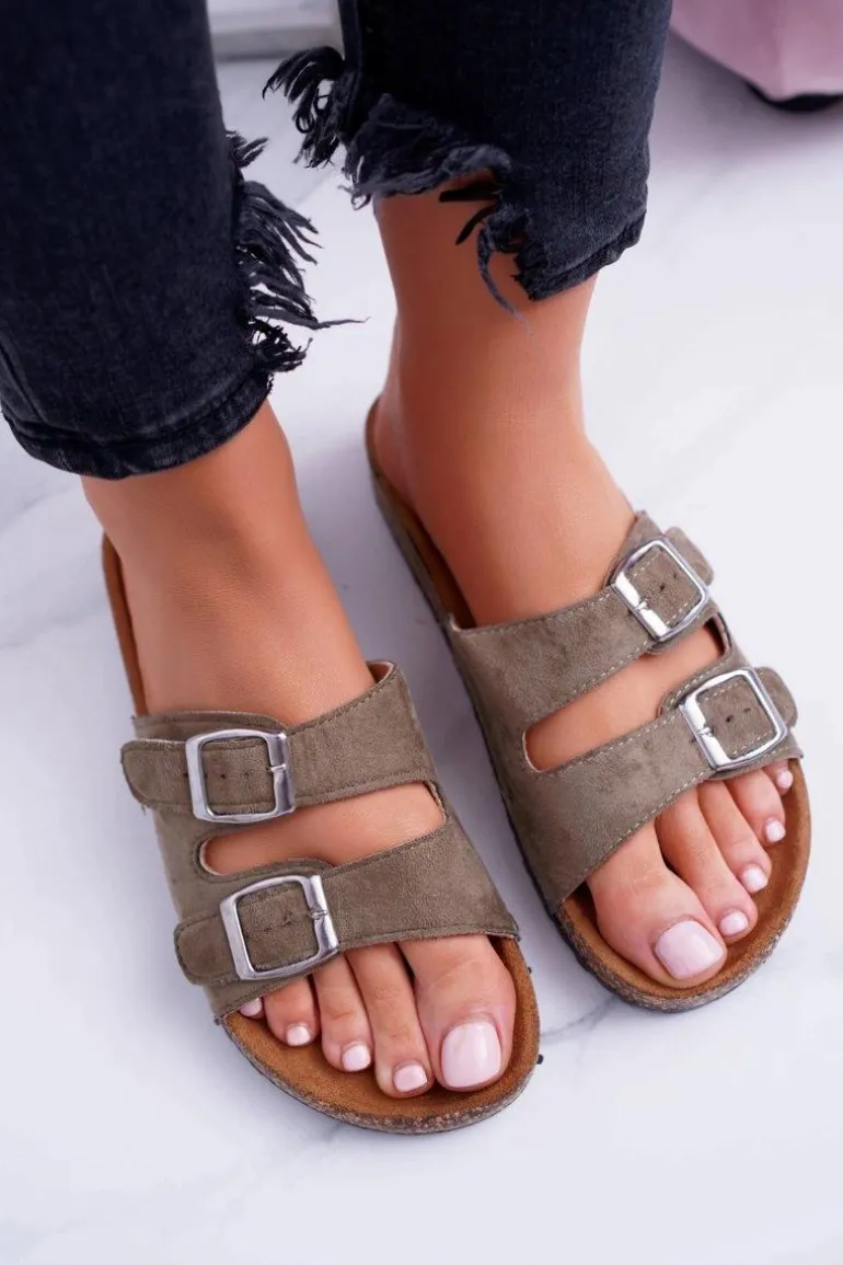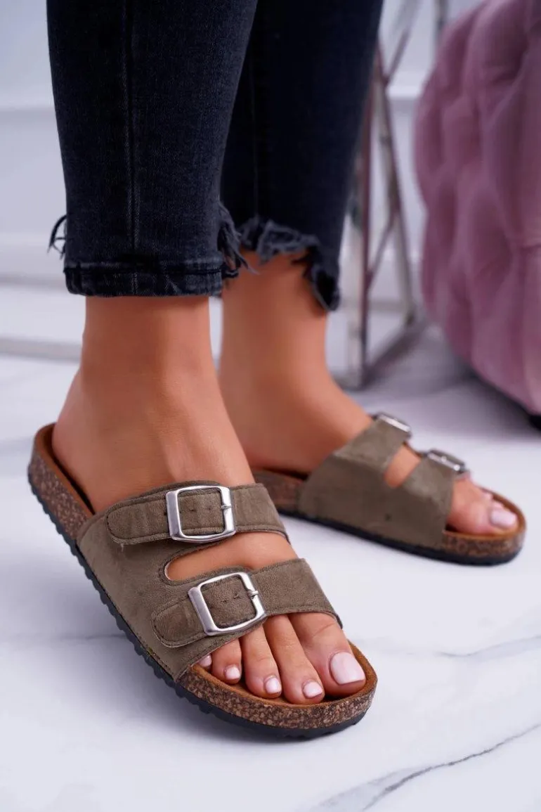 Oliwkowe Zamszowe Korkowe Damskie Klapki Klamry Beatris