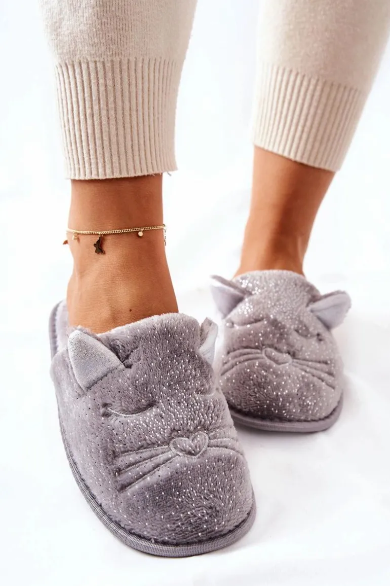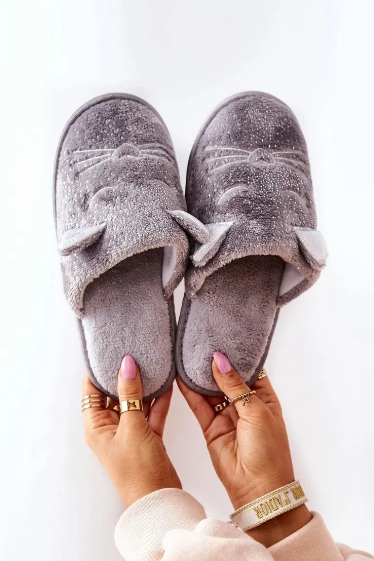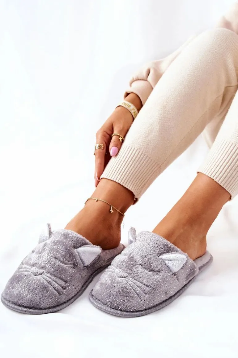 Błyszczące papcie na chłodne dni i wieczory. Wykonane z delikatnego i przyjemnego w dotyku materiału. Na przodzie znajduje się uroczy, wyszyty nosek z wąsami oraz przyszyte uszy. Papcie posiadają ocieplaną wkładkę. Spraw sobie nową parę papci i ciesz się wygodą i ciepłem! Przy wyborze rozmiaru prosimy sugerować się tabelą rozmiarów.