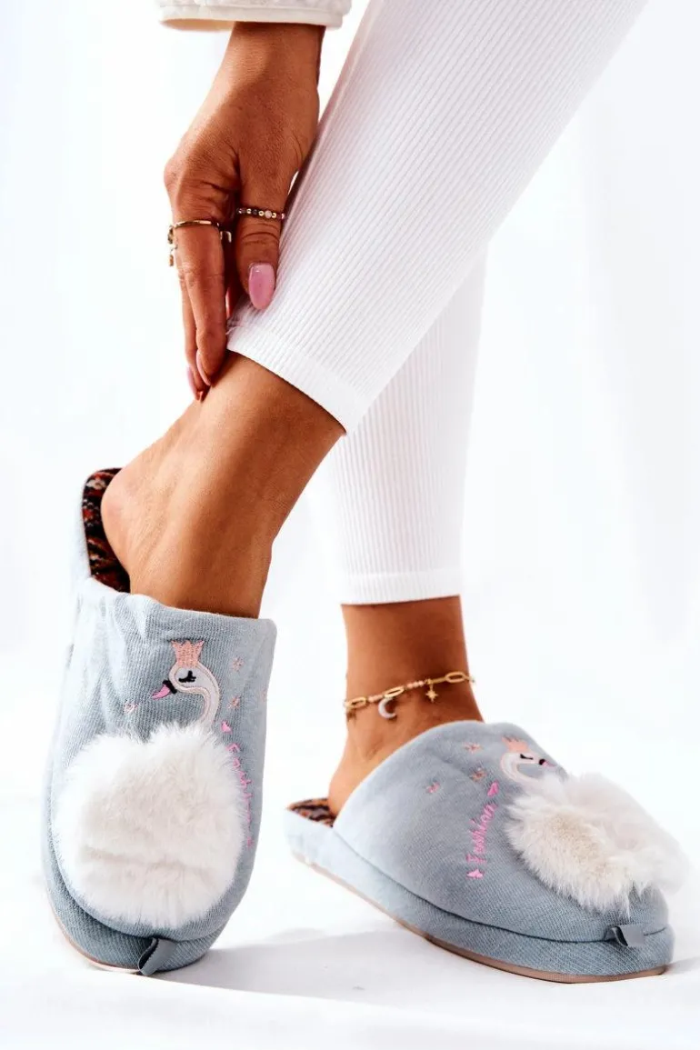 Klasyczne papcie wykonane z materiału. Posiadają ocieplenie w postaci przyjemnego w dotyku koca obuwniczego. Wkładka materiałowa. Z przodu papci widnieje piękny łabędź z futrzanym tułowiem. Posiadają grubą platformę, która świetnie izoluje od zimnego podłoża. Koniecznie musisz je mieć! Przy wyborze rozmiaru prosimy sugerować się tabelą rozmiarów.