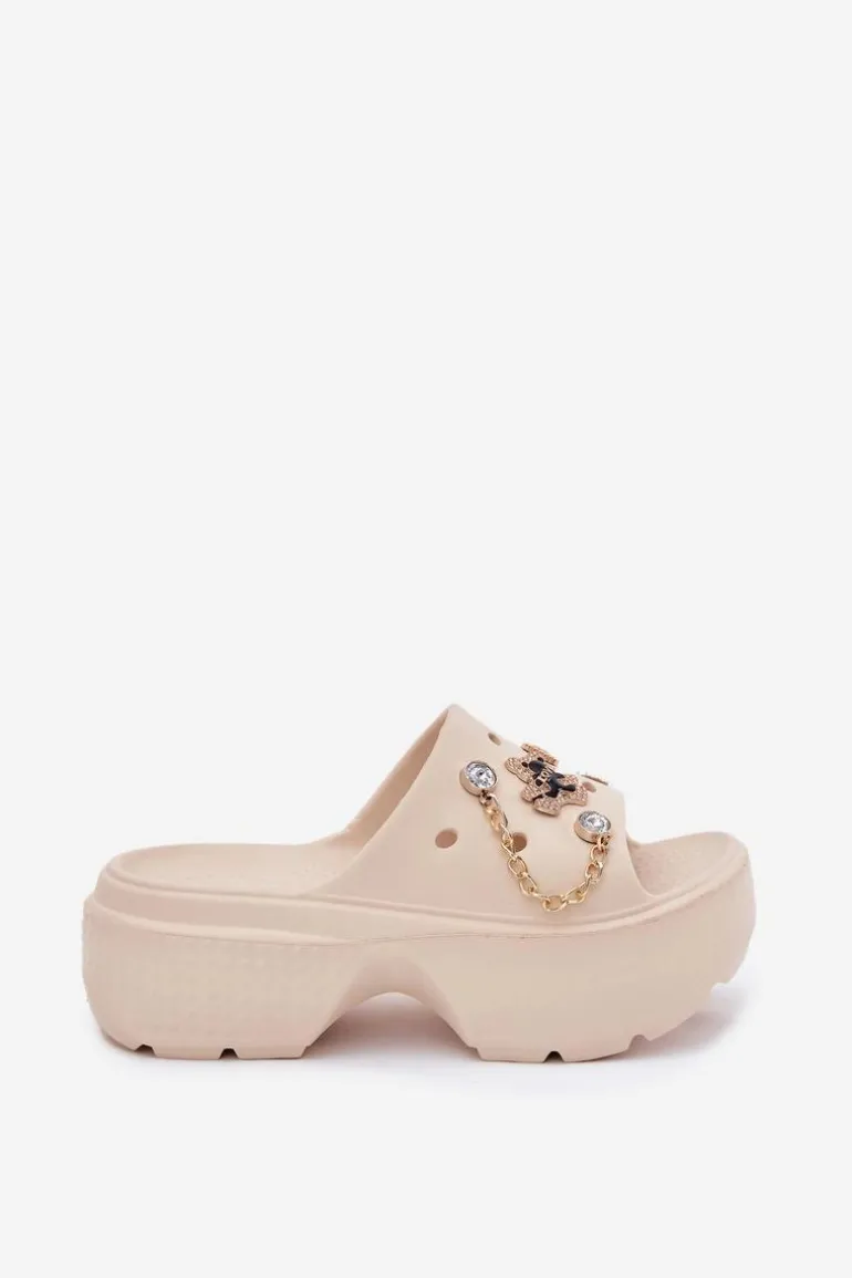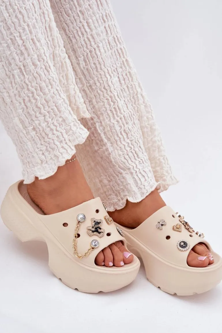 Klapki z piankowego tworzywa na masywnej platformie to świetny wybór na ciepłe dni. Złote przypinki na pasku przyciągają wzrok, nadając im stylowego charakteru. Idealne na co dzień, łączą komfort z modnym wyglądem. Przy wyborze rozmiaru prosimy sugerować się tabelą rozmiarów.