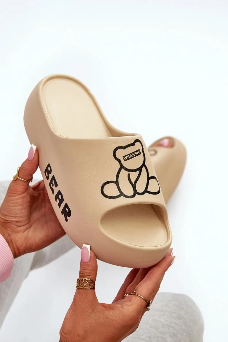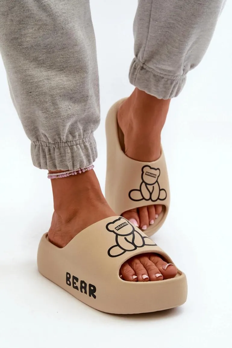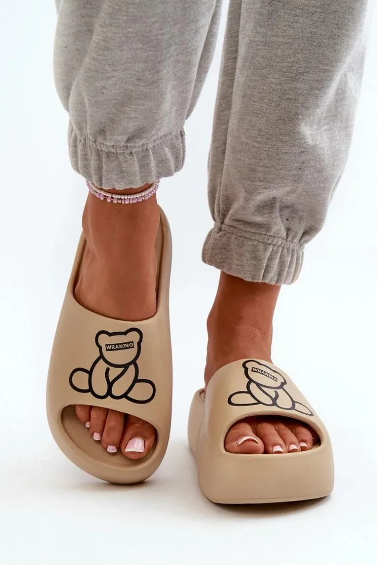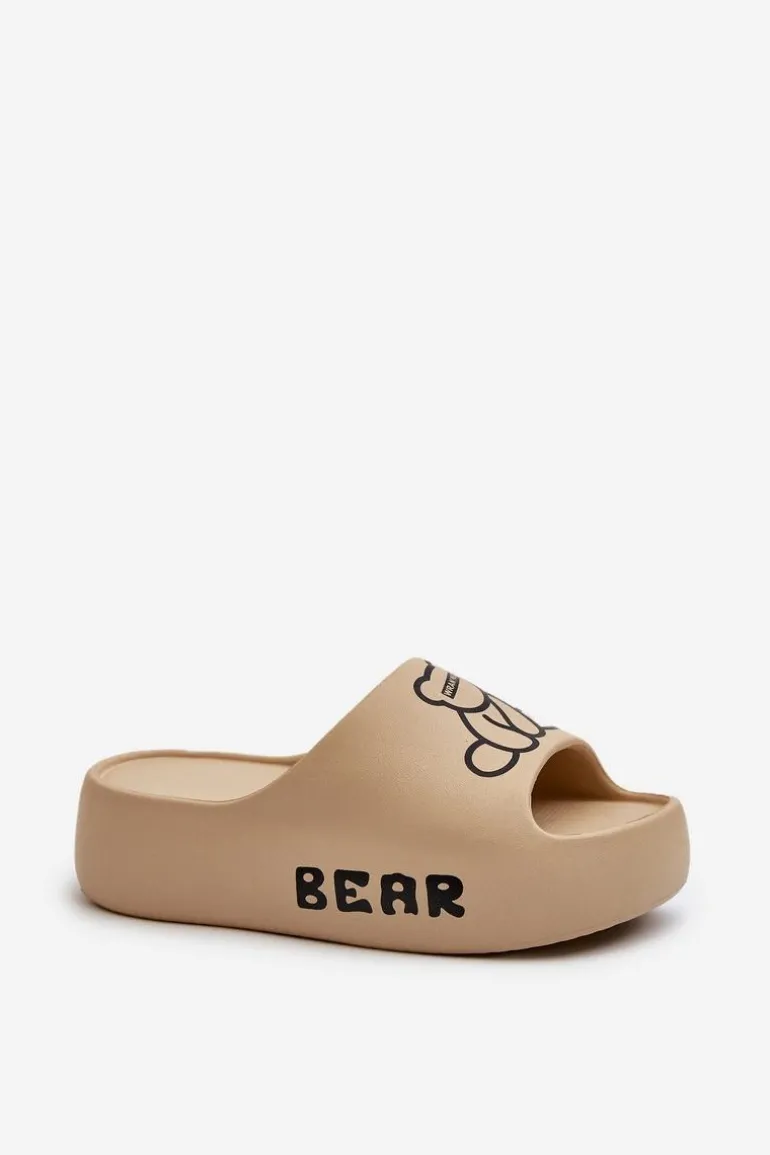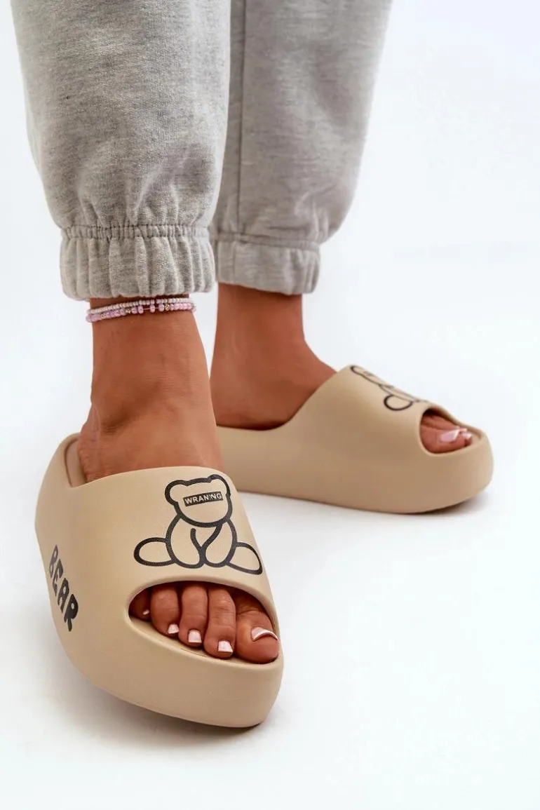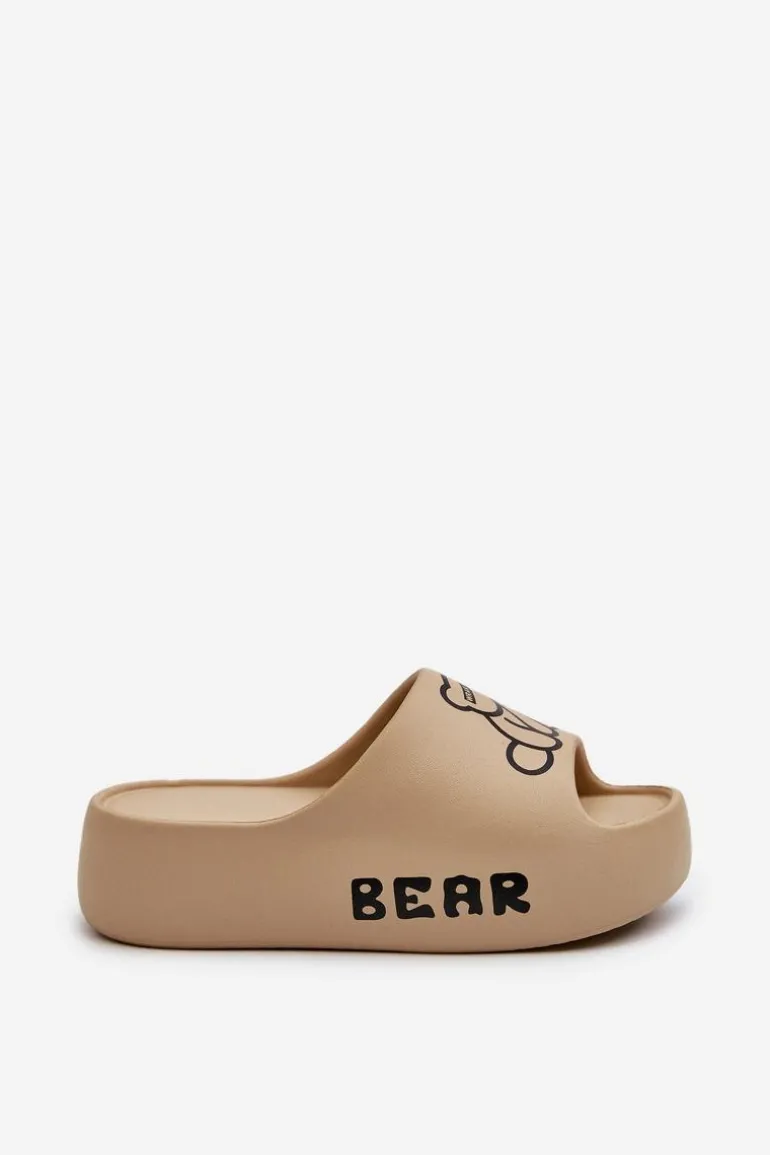 Piankowe Klapki Damskie Na Masywnej Podeszwie Z Misiem Ciemnobeżowe Lamira