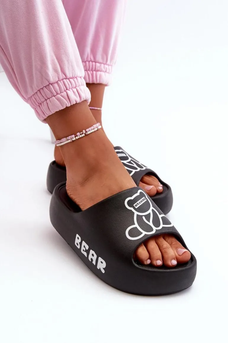 Lekkie damskie klapki na basen wykonane z piankowego tworzywa. Osadzone na masywnej podeszwie. Te urocze klapki zdobi nadruk z motywem misia, który dodaje im wyjątkowego charakteru. Idealne do codziennego użytku na, łączą wygodę i styl w jednym. Przy wyborze rozmiaru prosimy sugerować się tabelą rozmiarów.