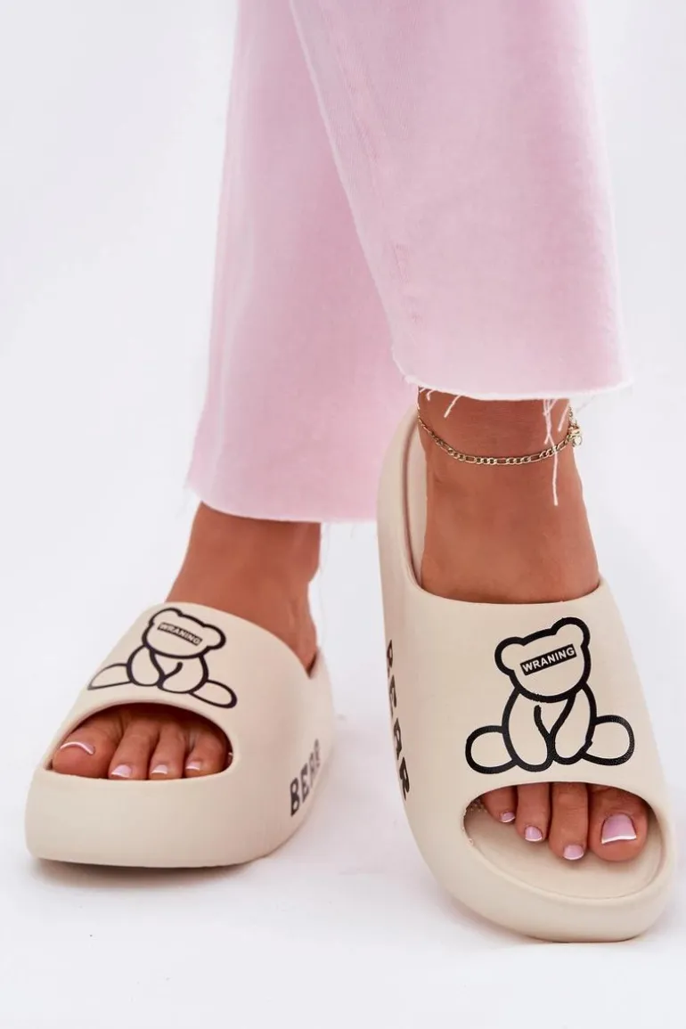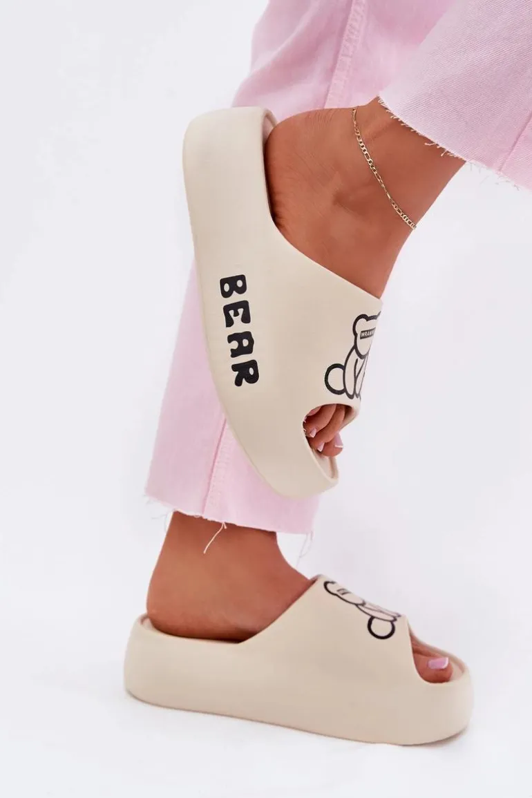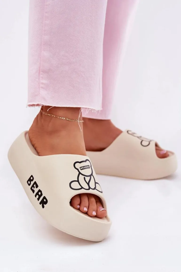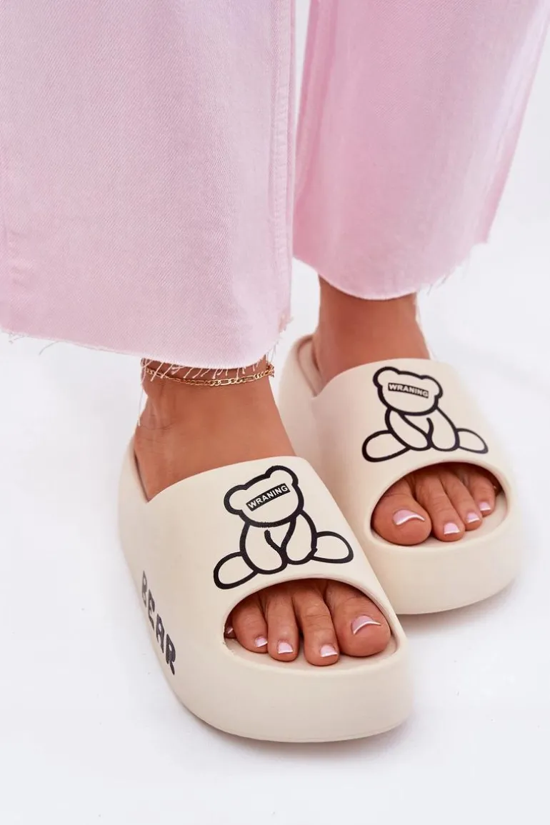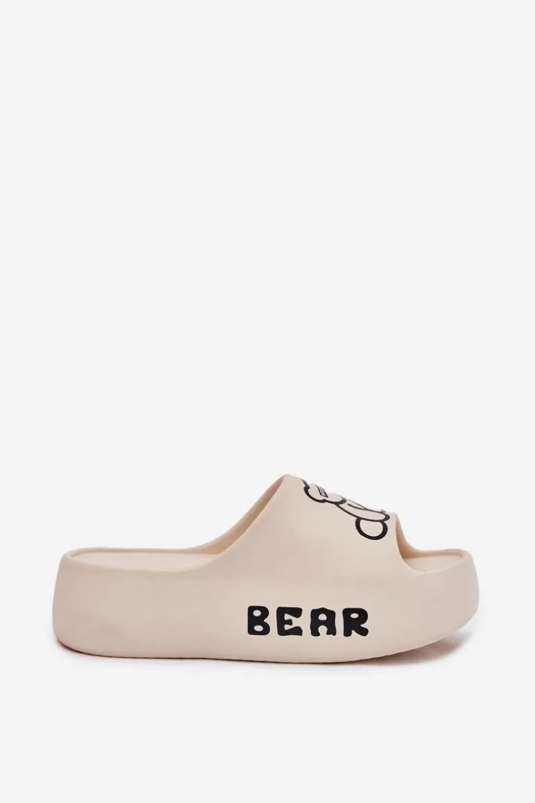Piankowe Klapki Damskie Na Masywnej Podeszwie Z Misiem Jasnobeżowe Lamira