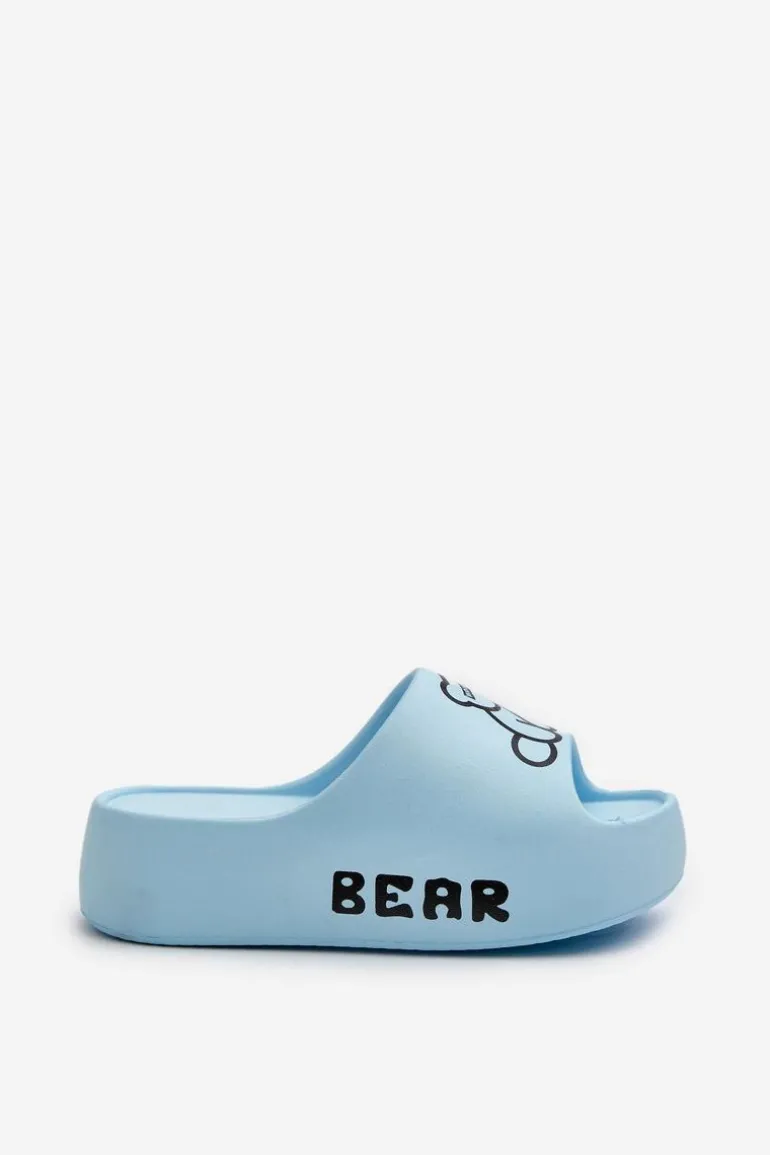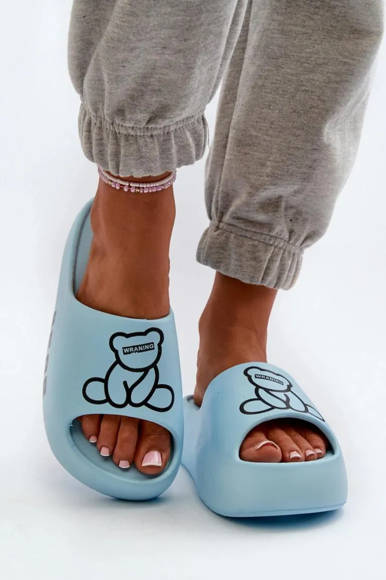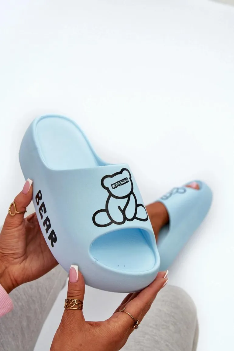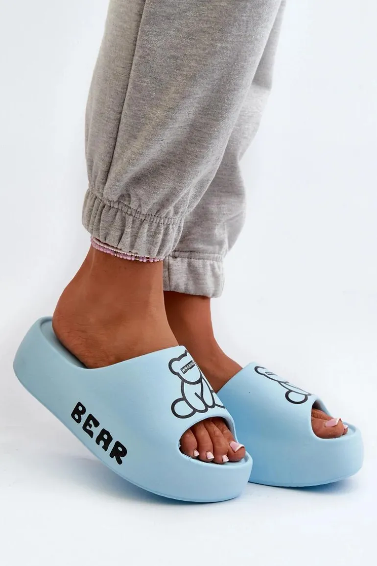Piankowe Klapki Damskie Na Masywnej Podeszwie Z Misiem Niebieskie Lamira