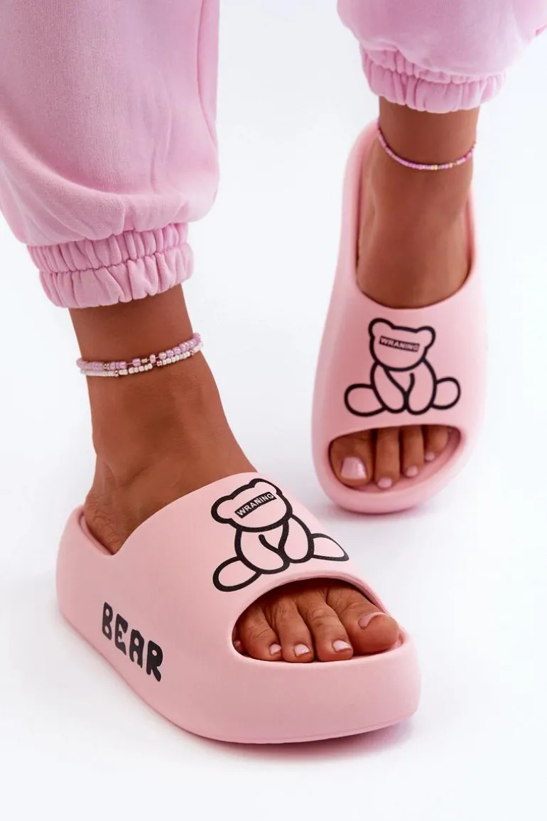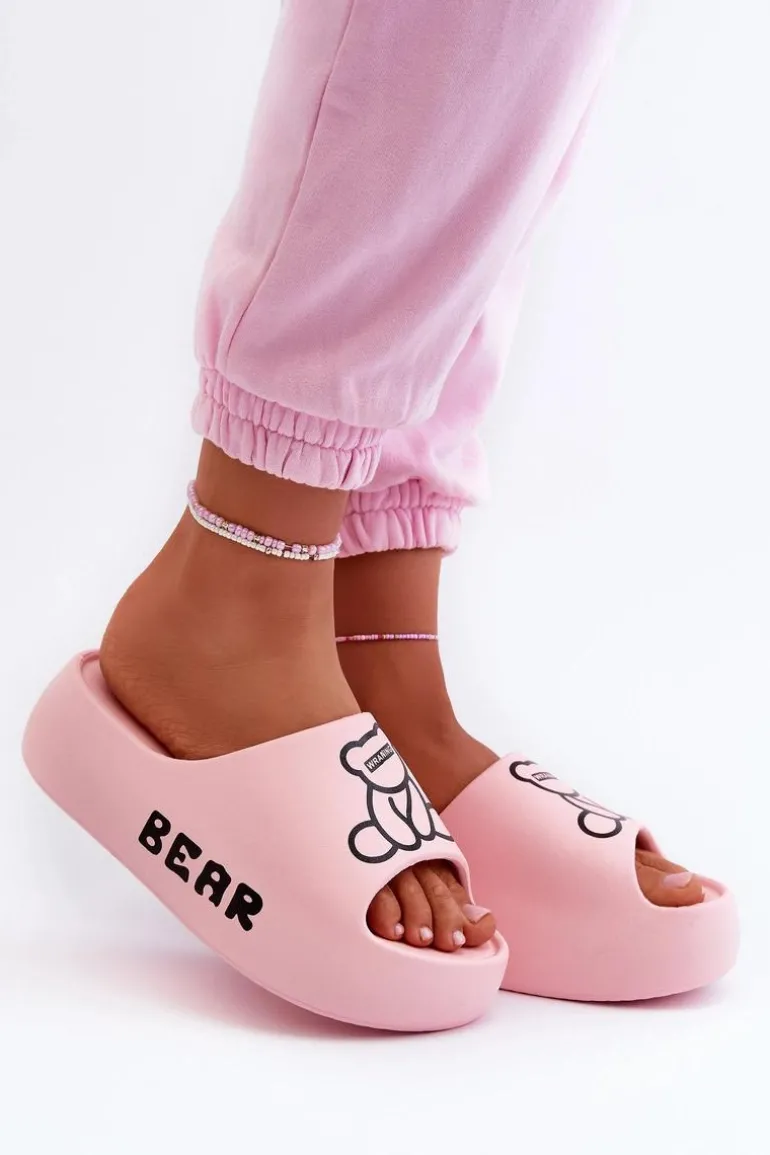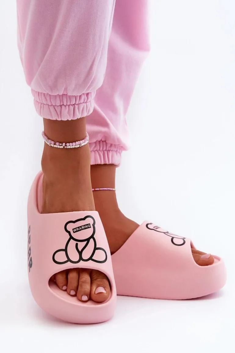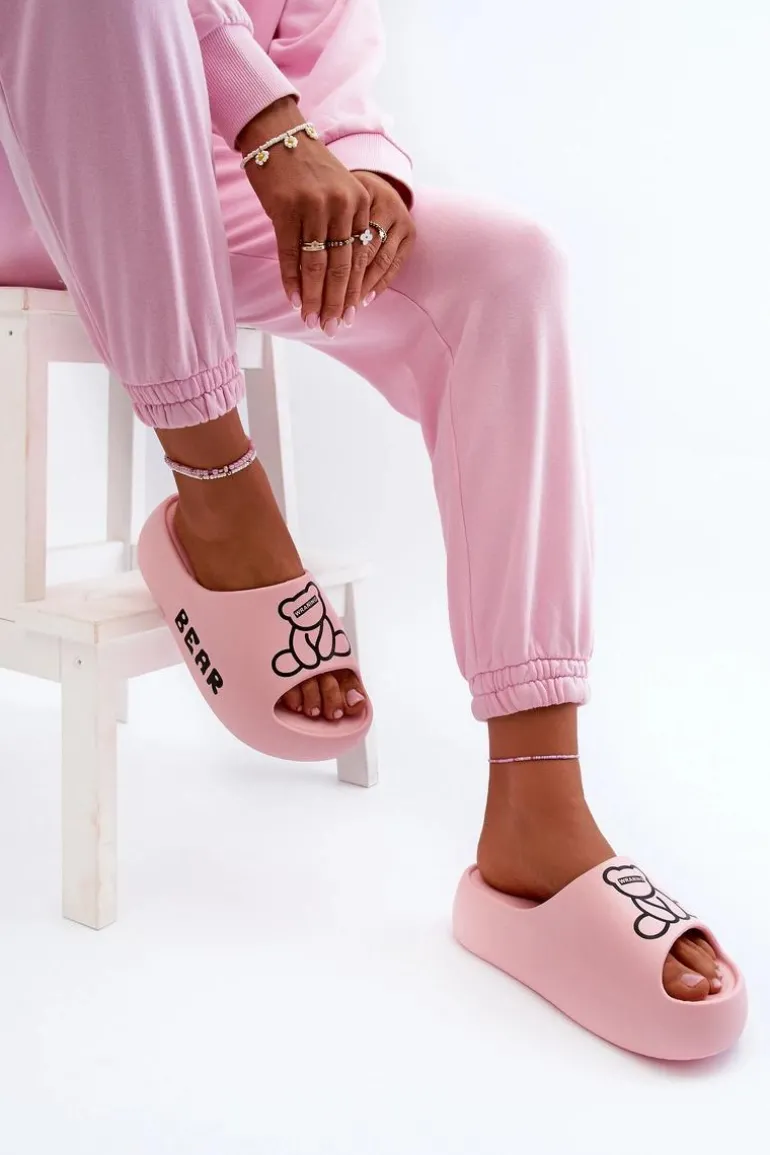 Piankowe Klapki Damskie Na Masywnej Podeszwie Z Misiem Różowe Lamira