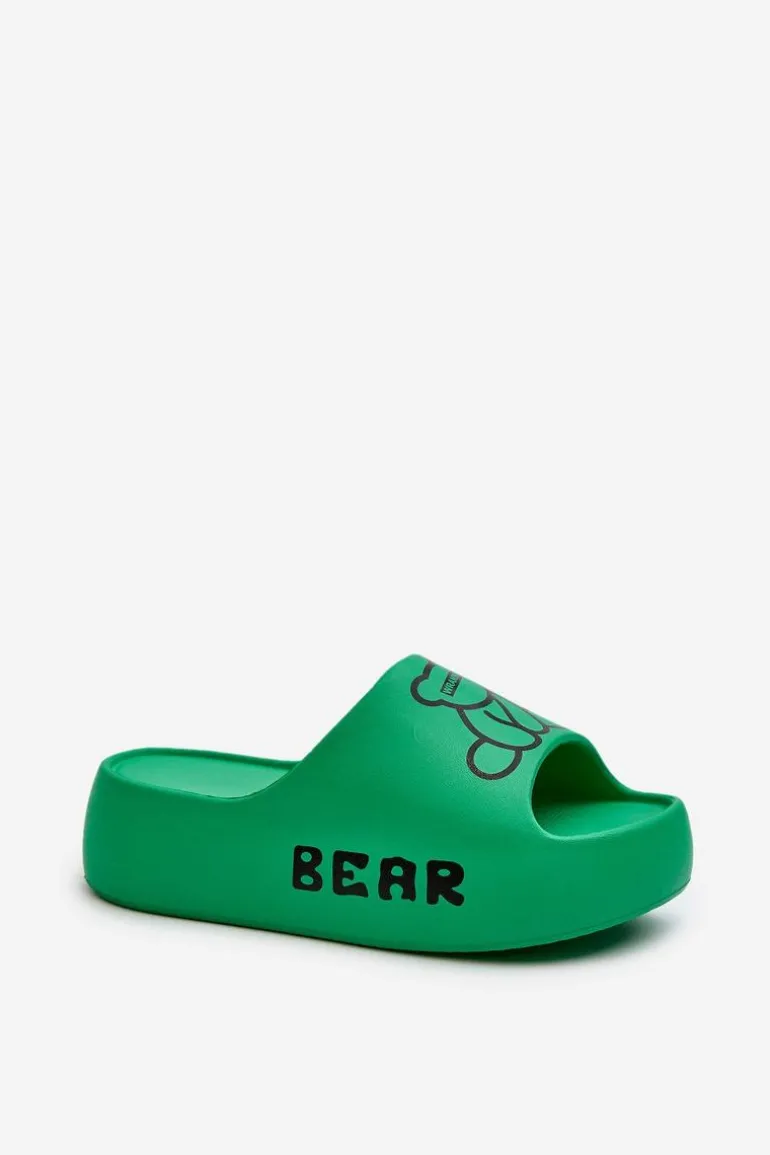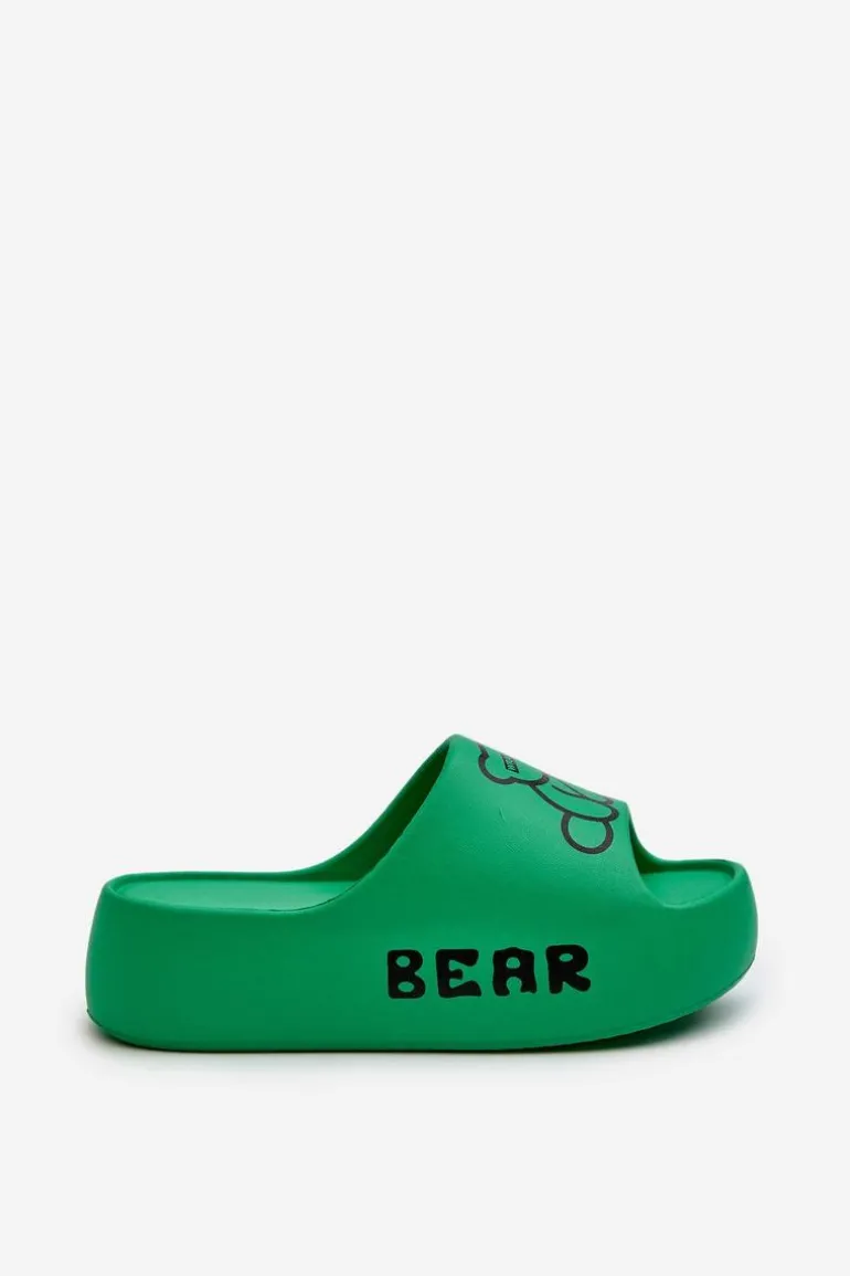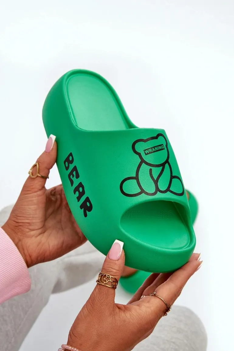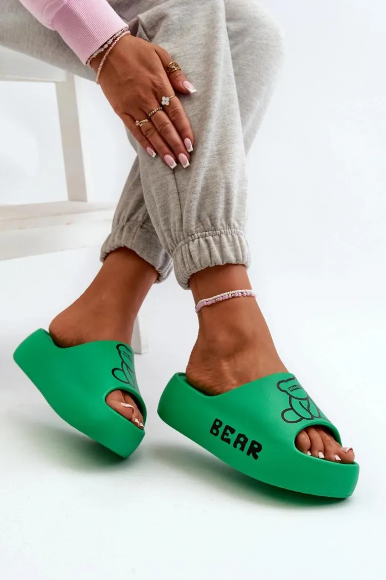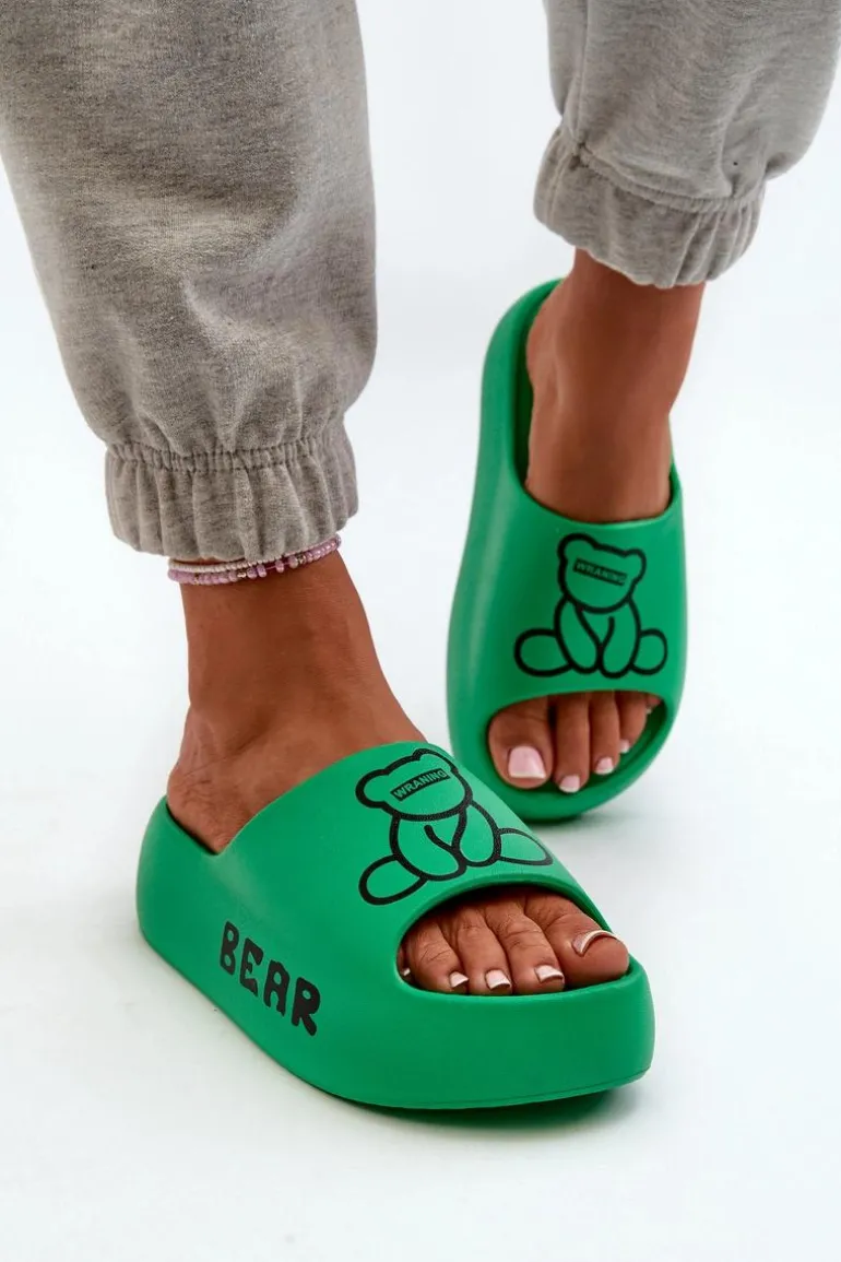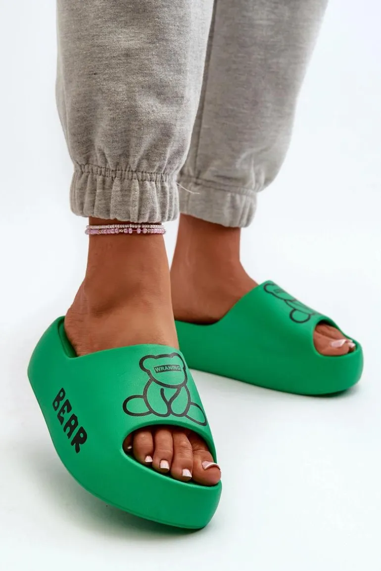 Piankowe Klapki Damskie Na Masywnej Podeszwie Z Misiem Zielone Lamira