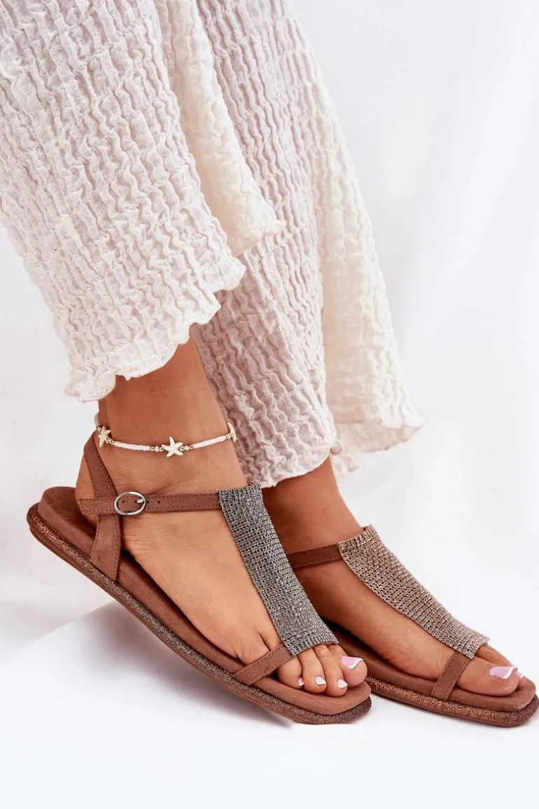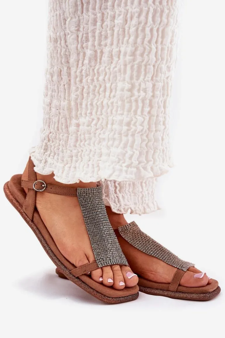 Eleganckie płaskie sandały damskie to perfekcyjny wybór na wyjątkowe okazje. Zapinane na sprzączkę z regulowanym paskiem, zapewniają idealne dopasowanie do stopy. Model wyróżnia się efektownym paskiem ozdobionym kryształkami, które dodają im szyku i blasku. Miękka, eko skórzana wkładka gwarantuje komfort przez cały dzień. Te sandały będą doskonałym uzupełnieniem eleganckich stylizacji na uroczystości i wieczorne wyjścia. Przy wyborze rozmiaru prosimy sugerować się tabelą rozmiarów.