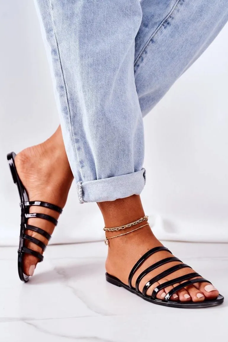 Klapki damskie wykonane z błyszczącego, gumowego tworzywa. Przy wyborze rozmiaru prosimy sugerować się tabelą rozmiarów.