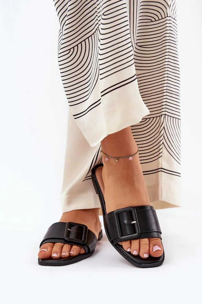 Płaskie Klapki Damskie Eko Skórzane Z Klamrą Czarne Bamma