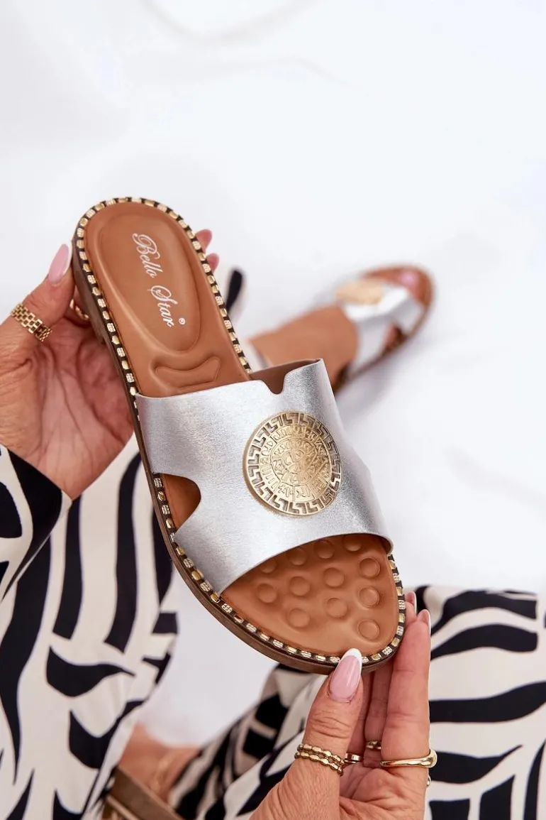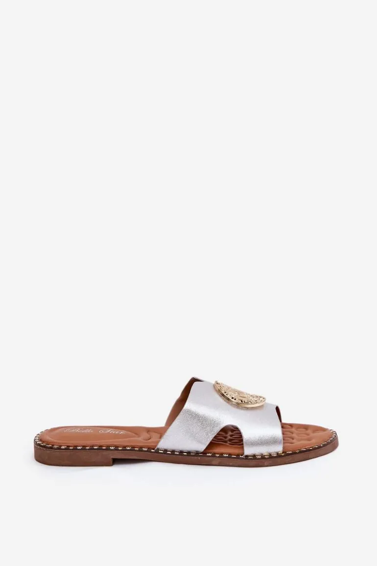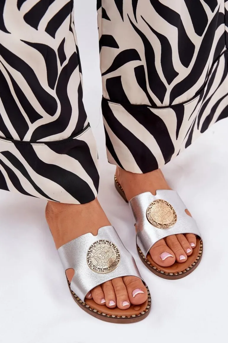 Płaskie Klapki Damskie Z Ozdobnym Detalem Srebrne Oferry