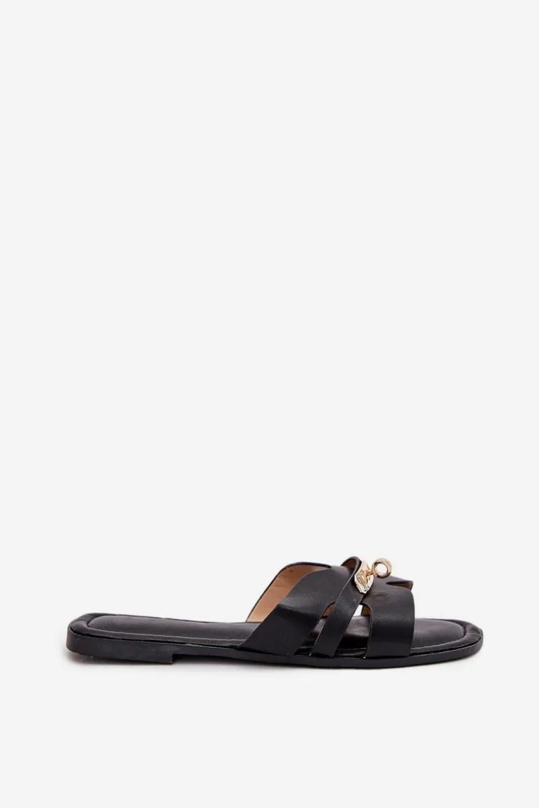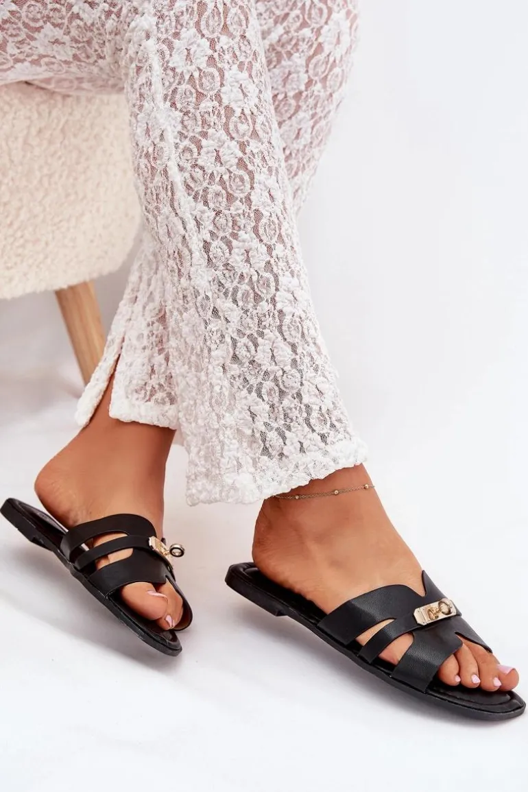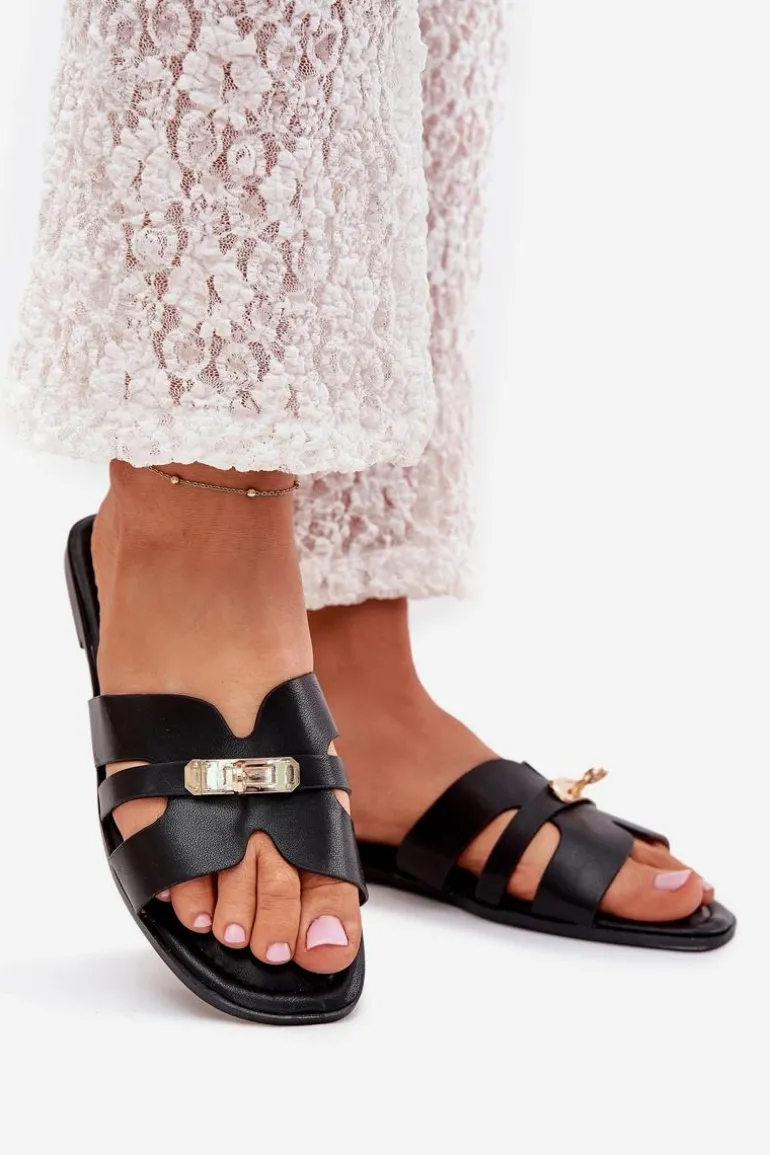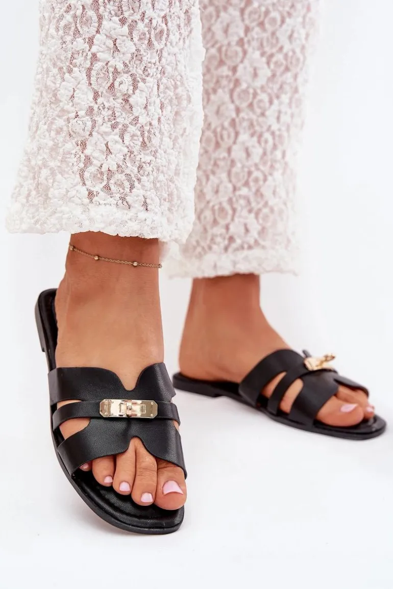 Płaskie Klapki Damskie Z Paseczkiem I Złotym Detalem Czarne Kerenza