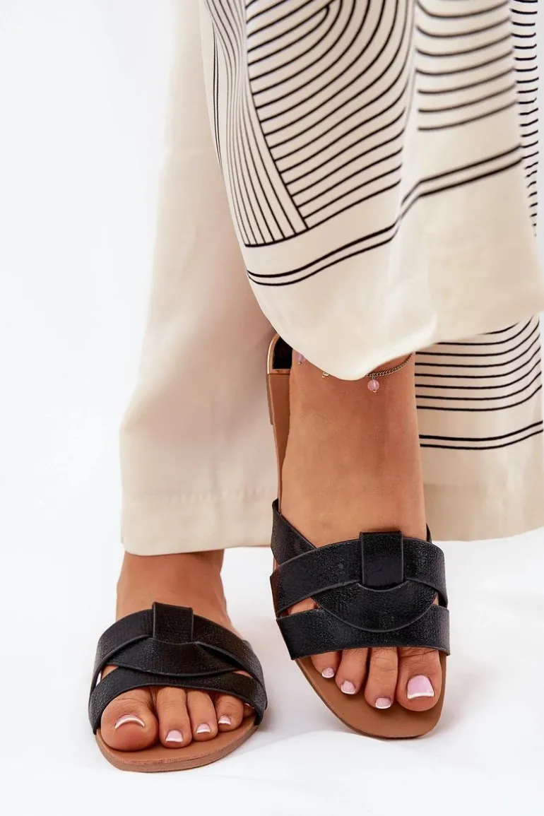 Płaskie klapki damskie z materiału tekstylnego, które charakteryzują się przeplatającymi się paskami z przodu, nadającymi im delikatnego uroku. Klasyczny fason sprawia, że będą doskonałym wyborem do wielu stylizacji, łącząc wygodę z prostym, eleganckim wyglądem. Przy wyborze rozmiaru prosimy sugerować się tabelą rozmiarów.