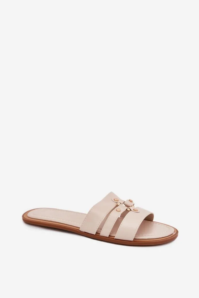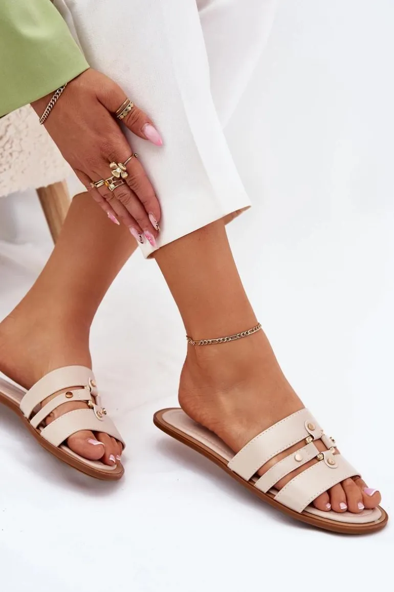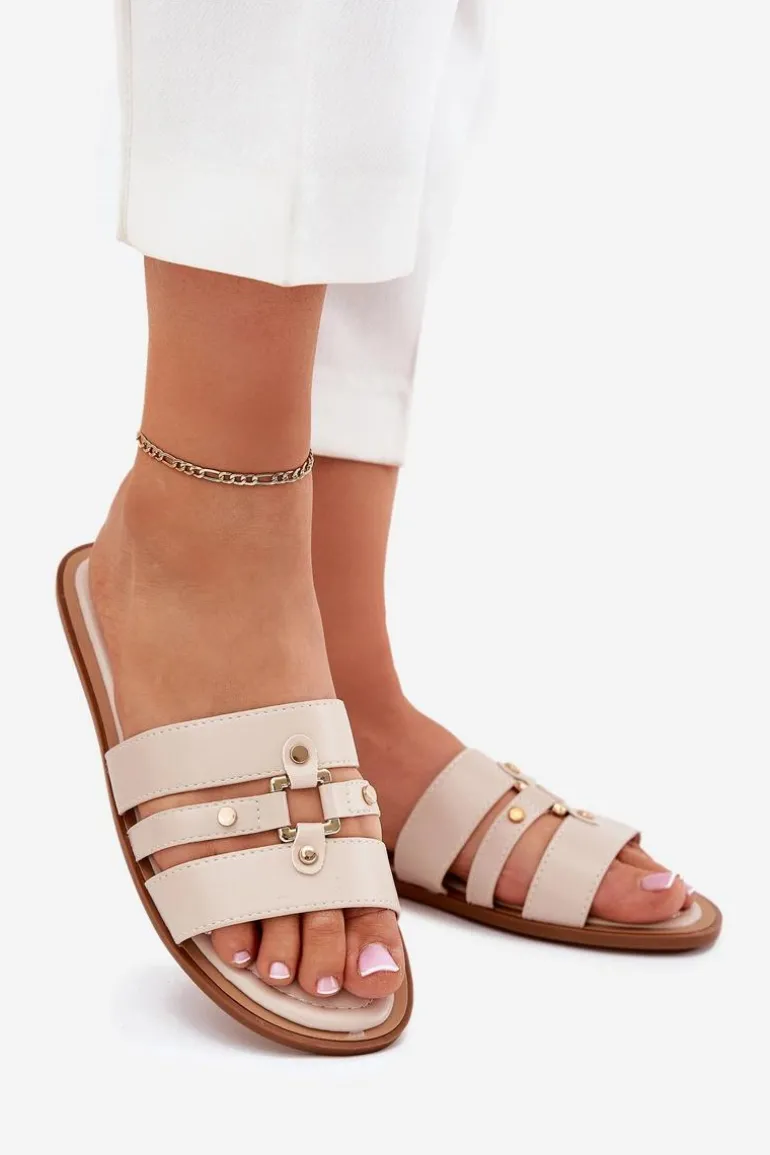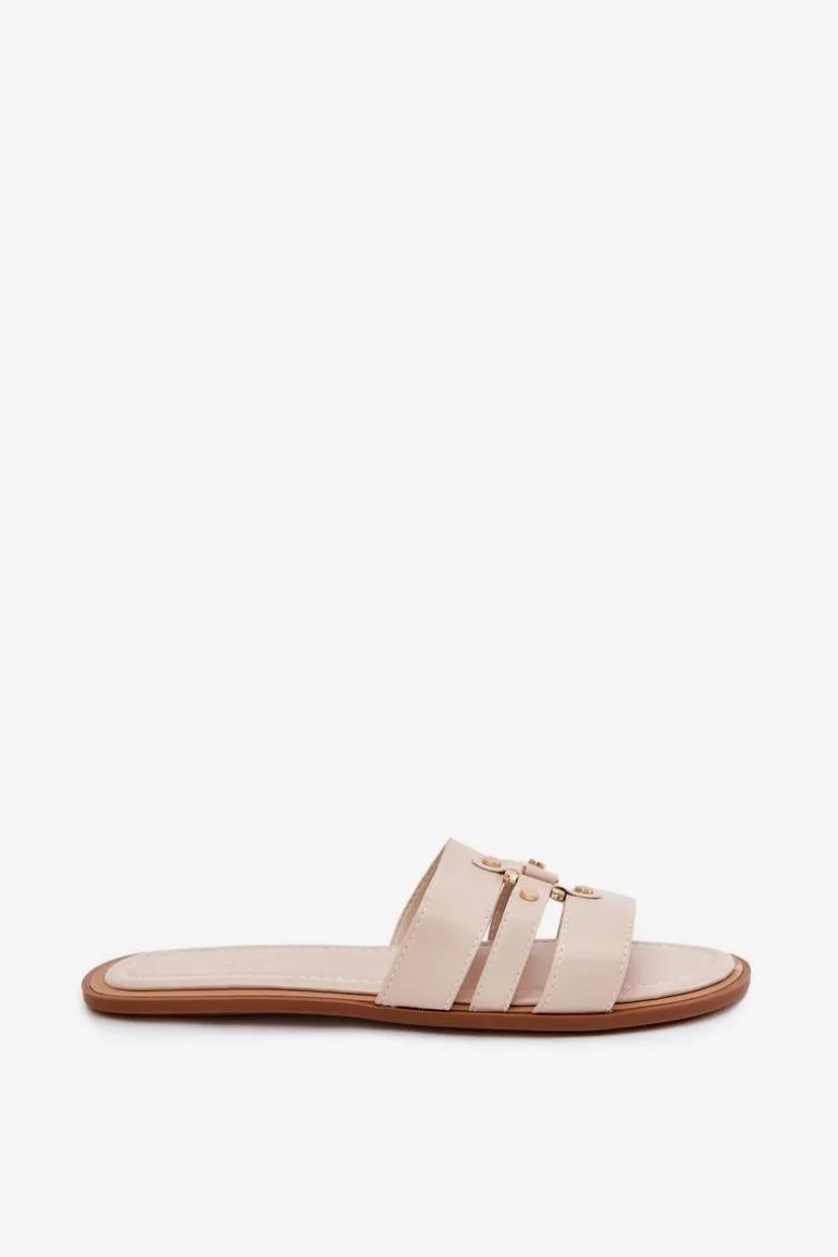 Klapki damskie płaskie o klasycznym fasonie to uniwersalna opcja do sukienek i spodni. Złoty detal łączący paseczki dodaje im eleganckiego charakteru, sprawiając, że doskonale komponują się z różnymi stylizacjami. Wygodne i stylowe, będą świetnym wyborem na ciepłe dni. Przy wyborze rozmiaru prosimy sugerować się tabelą rozmiarów.