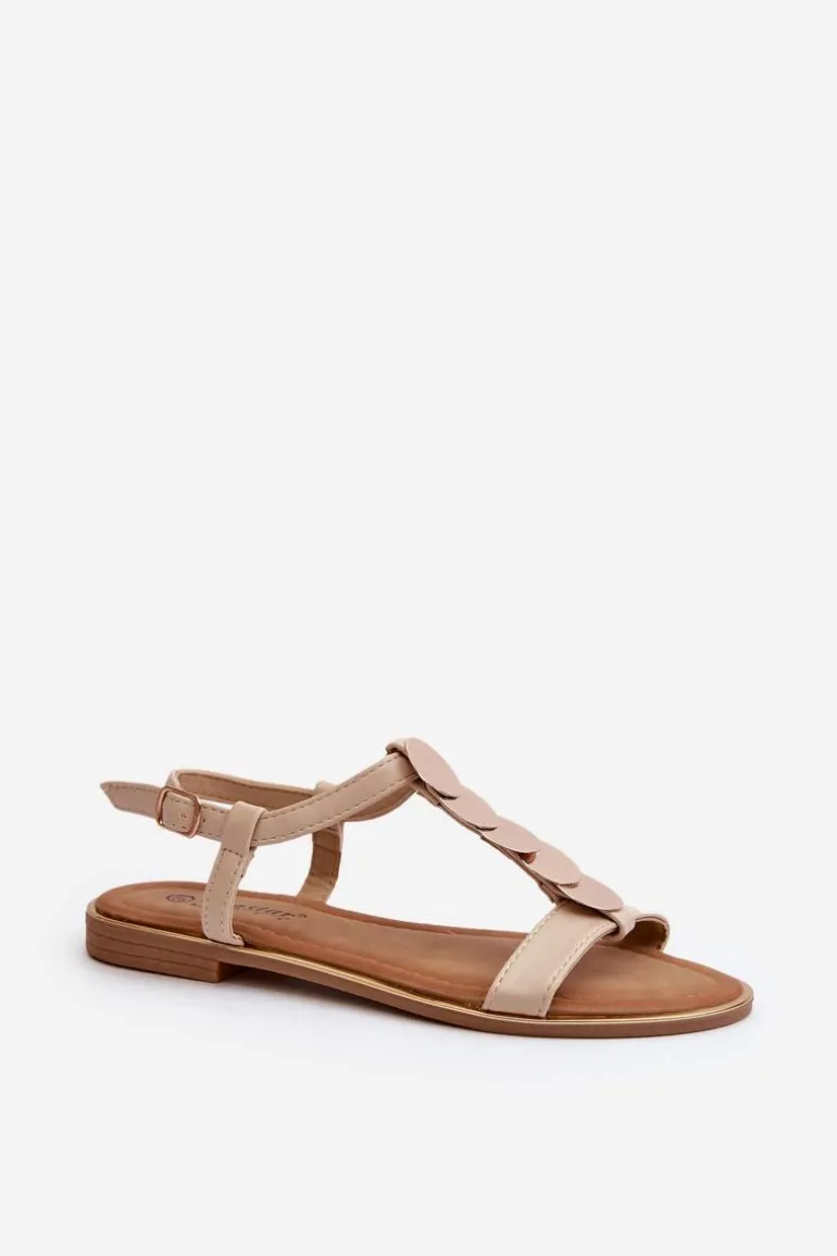 Płaskie sandały damskie wykonane z eko skóry. Ozdobione złotymi detalami. Zapinane na regulowany pasek ze sprzączką dla idealnego dopasowania. Model ten z pewnością dopasujesz do wielu stylizacji! Przy wyborze rozmiaru prosimy sugerować się tabelą rozmiarów.