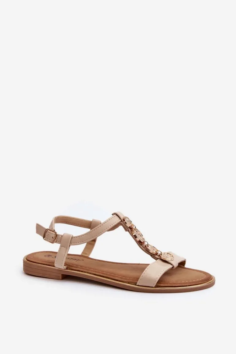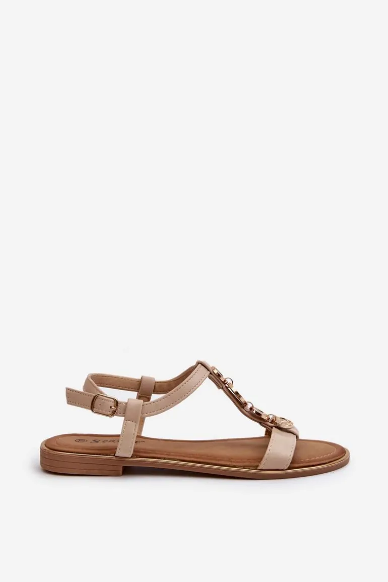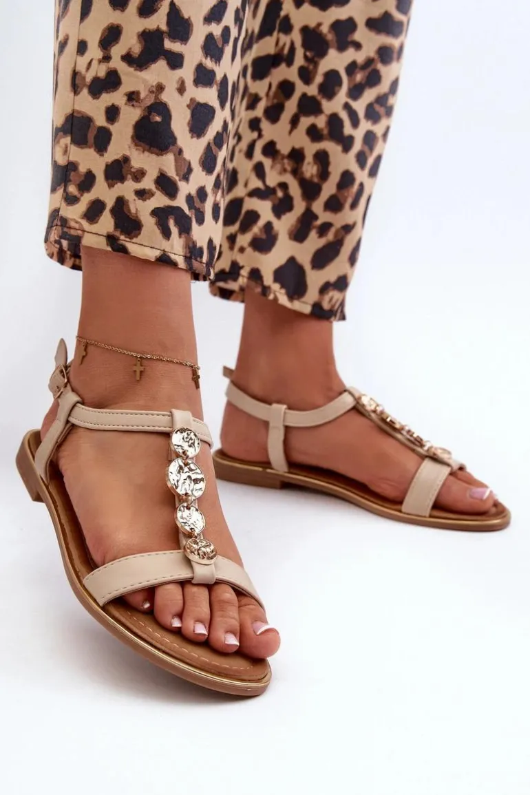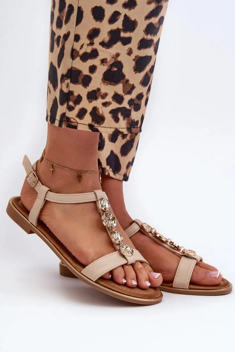 Sandały damskie z subtelnymi złotymi ozdobami. Wykonane z eko skóry. Osadzone na płaskim obcasie. Zapinane na regulowany pasek ze sprzączką, są zarówno modne, jak i wygodne. Idealne do codziennych stylizacji. Przy wyborze rozmiaru prosimy sugerować się tabelą rozmiarów.