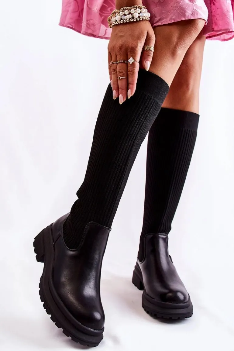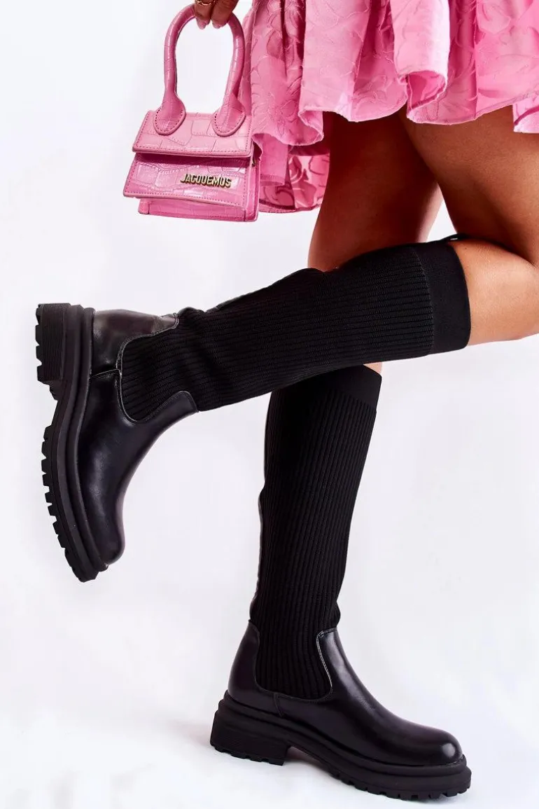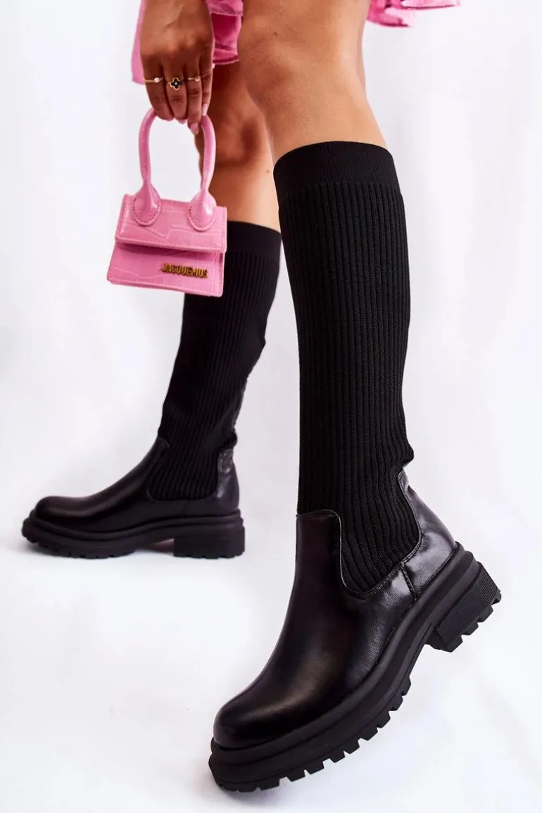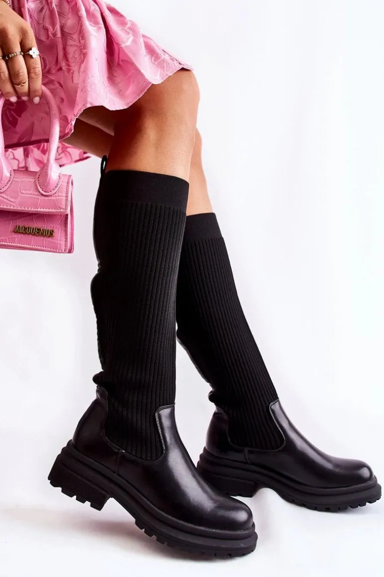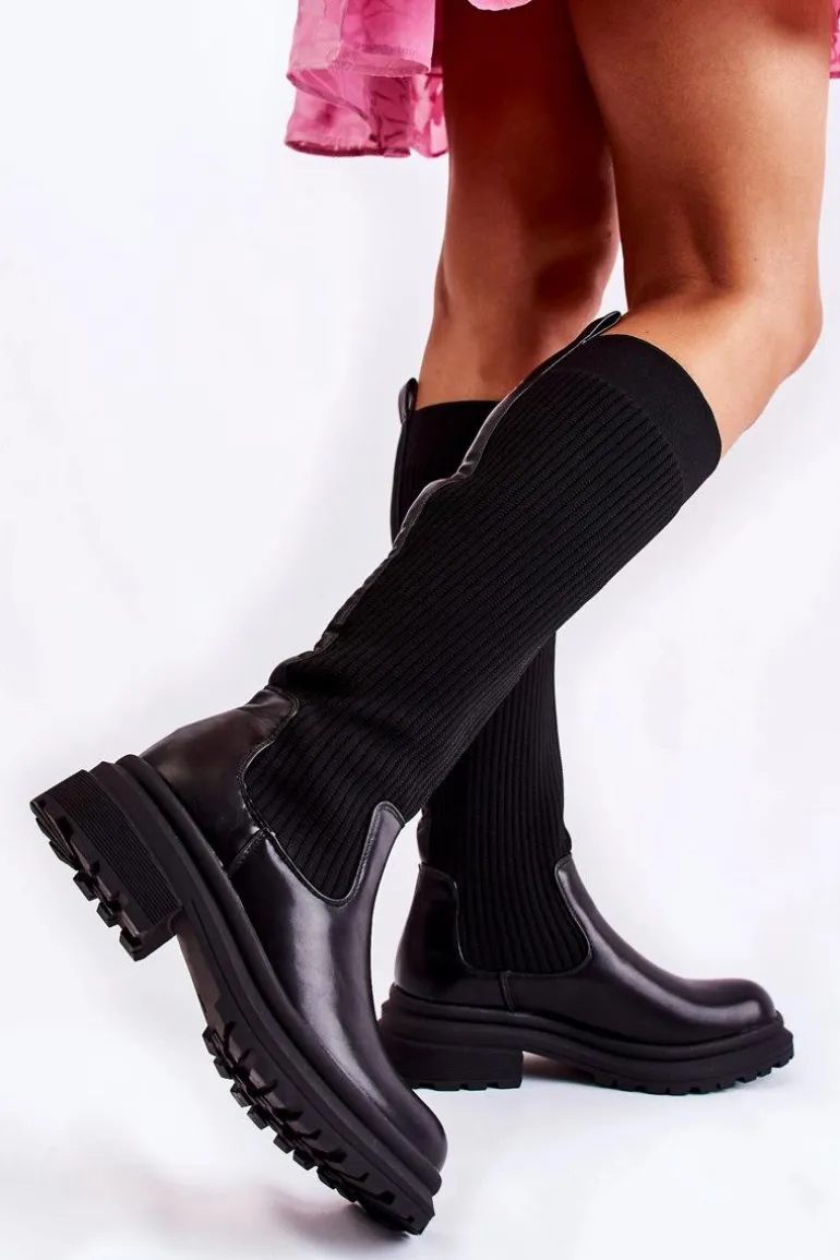 Prążkowane Damskie Kozaki Na Płaskim Obcasie Czarne Allys