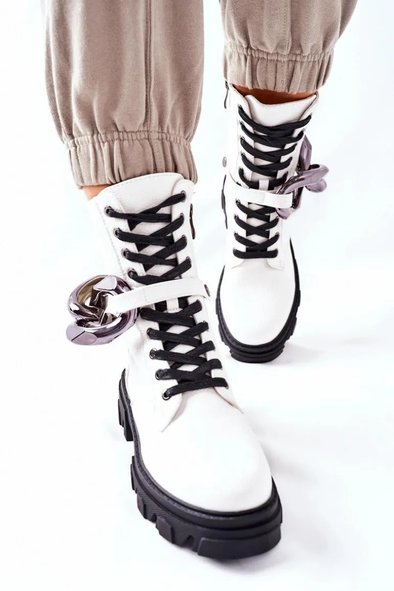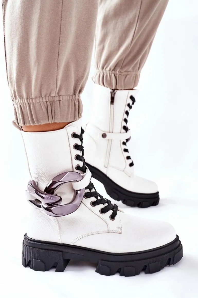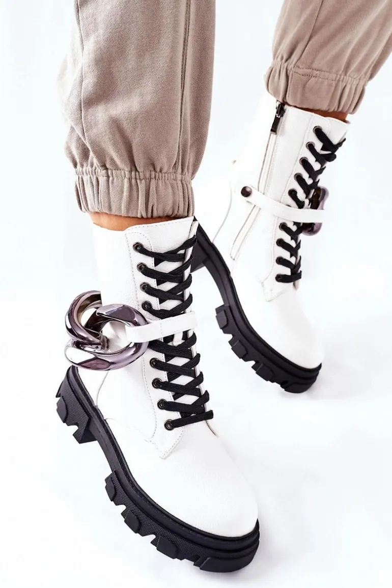 Szukasz mocniejszego stylu? Dobrze trafiłaś, bo te botki spełniają Twoje wymagania! Noś na różne sposoby, ozdobę – łańcuch możesz dowolnie odpiąć. Wysoka cholewka oraz masywna podeszwa – co tu więcej dodawać? Klasyczny fason ze sznurowaniem. Odporna na zabrudzenia skóra ekologiczna, to najlepszy wybór na jesienno-zimowe spacery. Przy wyborze rozmiaru prosimy sugerować się tabelą rozmiarów.