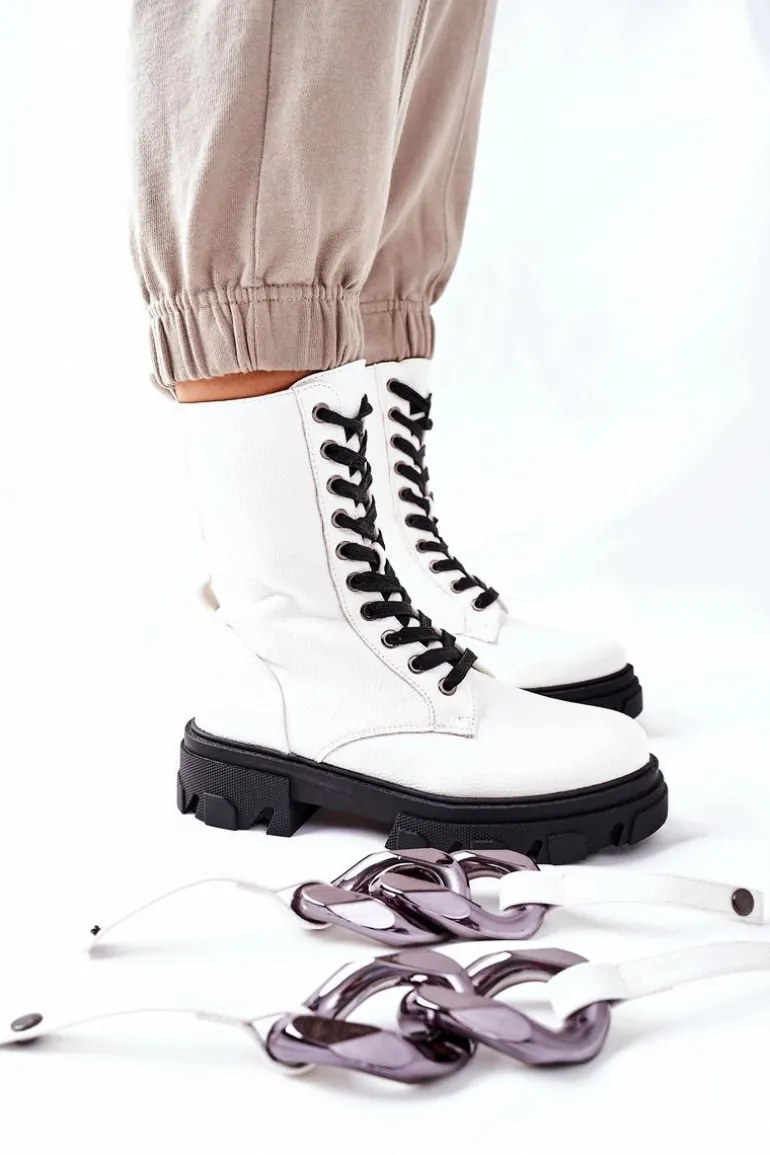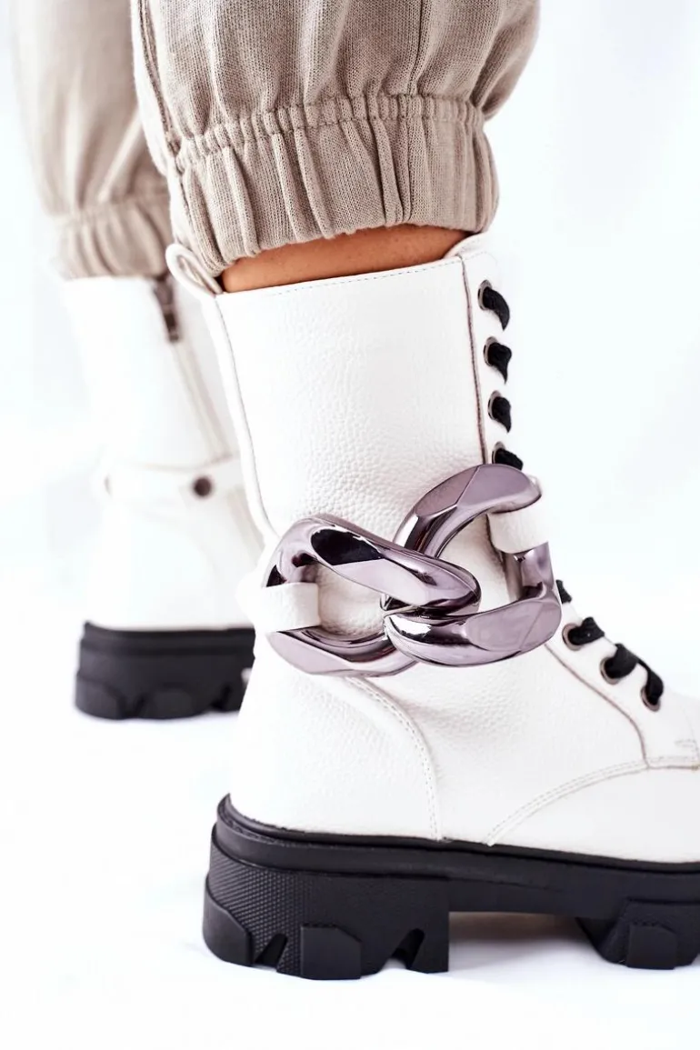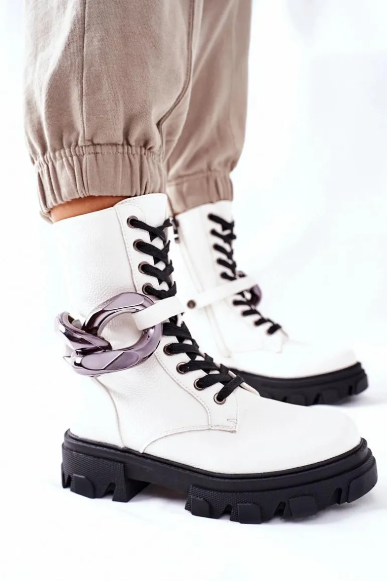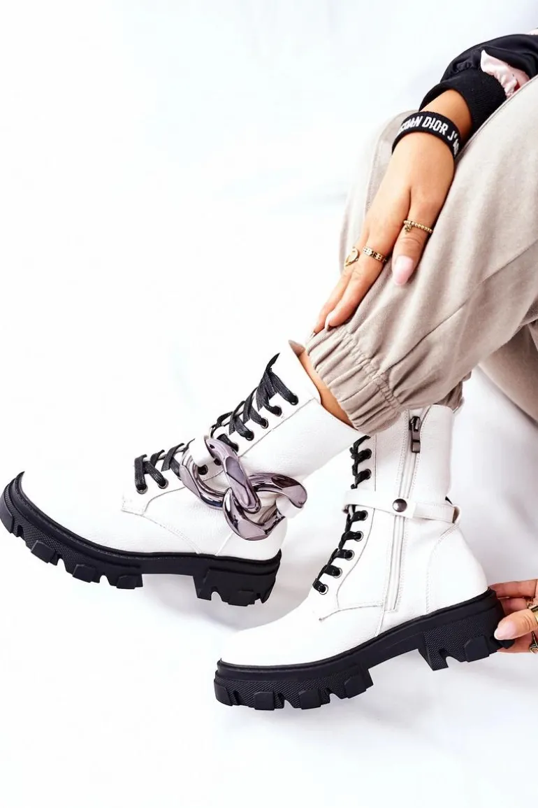 Szukasz mocniejszego stylu? Dobrze trafiłaś, bo te botki spełniają Twoje wymagania! Noś na różne sposoby, ozdobę – łańcuch możesz dowolnie odpiąć. Wysoka cholewka oraz masywna podeszwa – co tu więcej dodawać? Klasyczny fason ze sznurowaniem. Odporna na zabrudzenia skóra ekologiczna, to najlepszy wybór na jesienno-zimowe spacery. Przy wyborze rozmiaru prosimy sugerować się tabelą rozmiarów.