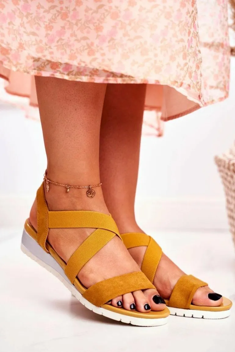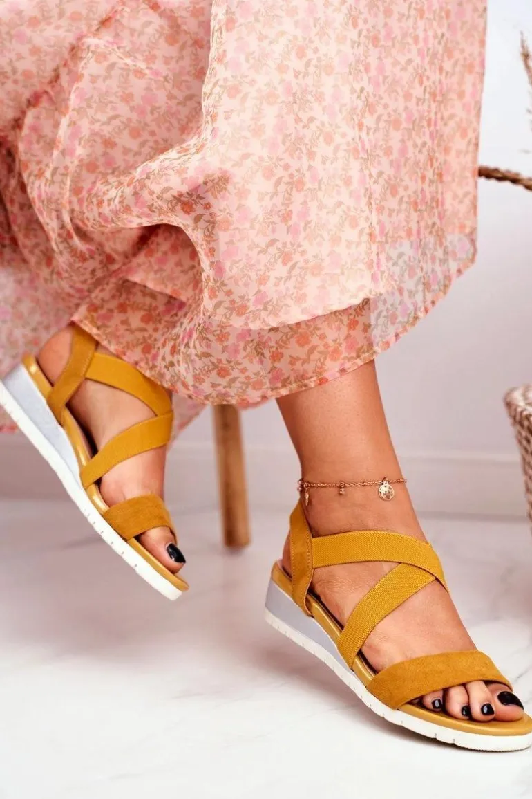 Sandałki Damskie Na Koturnie Żółte Wsuwane Harper