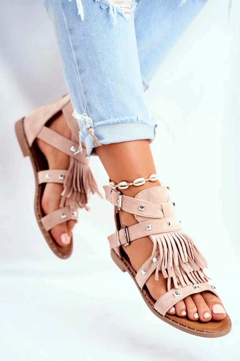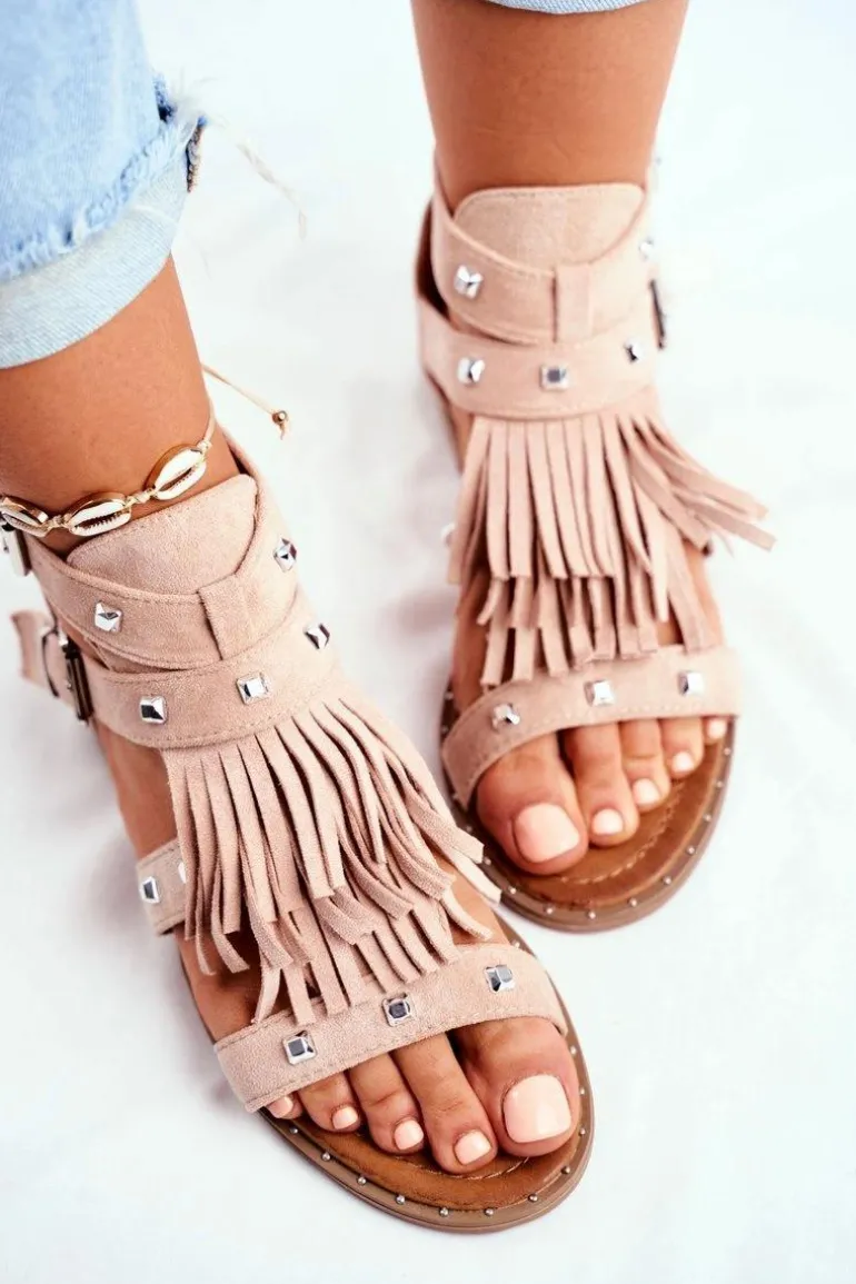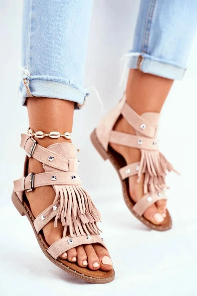 Tym razem coś dla Pań, które cenią sobie elegancki look nawet podczas upalnych letnich dni. Niesamowite sandałki w stylu boho, które podbijają serca kobiet. Wysoka cholewka, delikatne frędzle oraz srebrne dżety, sandałki które mają to coś! Suwak na zapiętku ułatwi zakładanie natomiast regulowane paski zadbają o lepsze dopasowanie do nogi. Przy wyborze rozmiaru prosimy sugerować się tabelą rozmiarów.