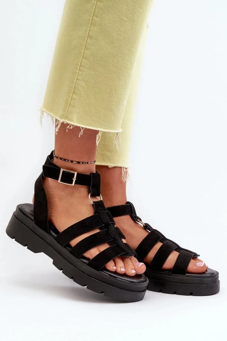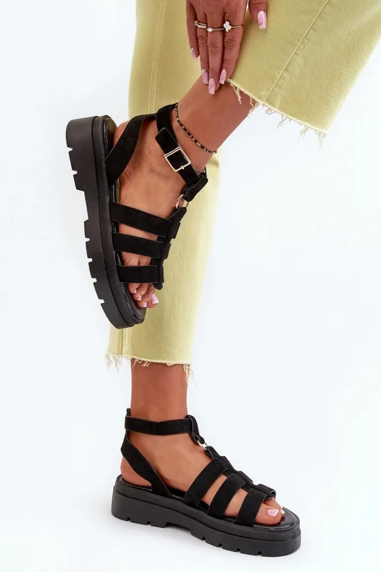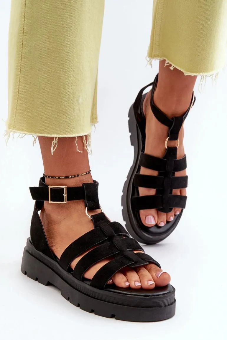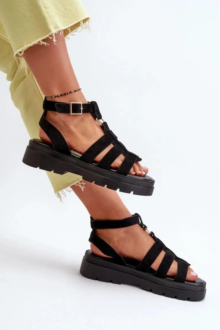 Sandały damskie w stylu gladiatorek. Wykonane z eko zamszu. Regulowany pasek ze sprzączką zapewnia idealne dopasowanie do stopy, zapewniając jednocześnie komfort i stabilność podczas noszenia. Idealne do letnich stylizacji! Przy wyborze rozmiaru prosimy kierować się tabelą rozmiarów.