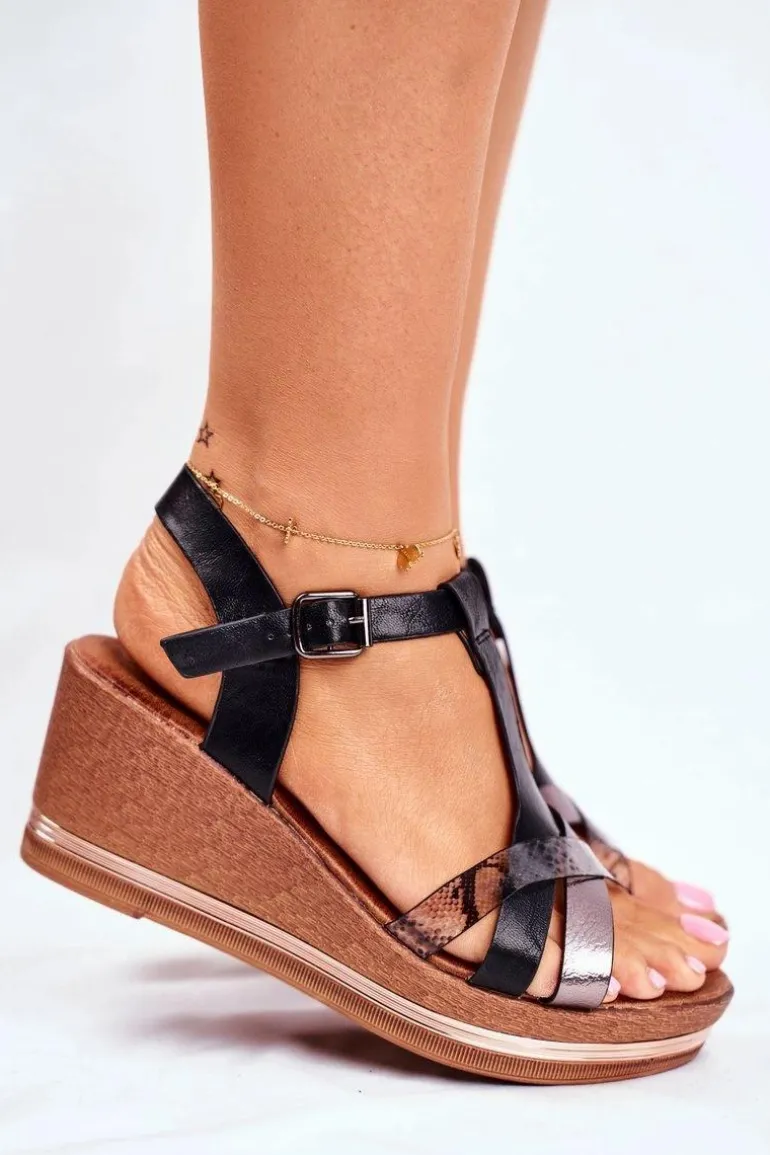 Sandały Damskie Na Koturnie Czarne Skóra Węża Enroll