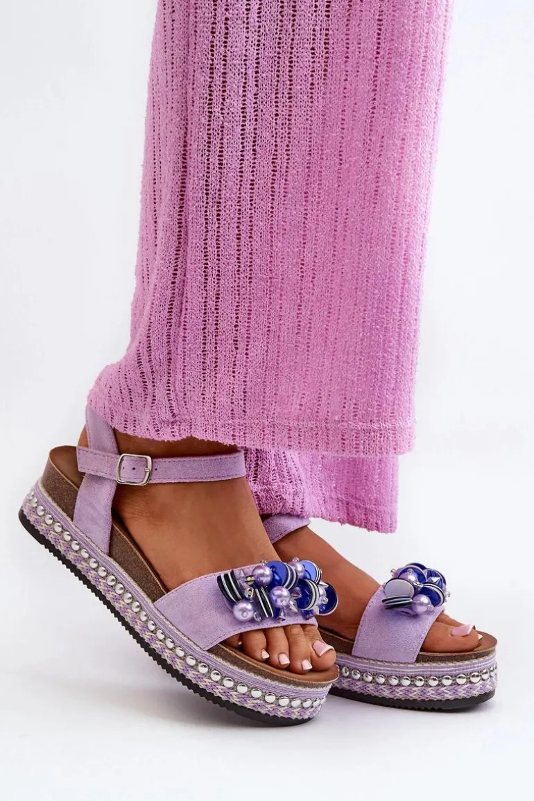 Sandały damskie wykonane z eko zamszu. Osadzone na zdobionej platformie i delikatnym koturnie. Regulowany pasek ze sprzączką gwarantuje idealne dopasowanie do stopy. Dodatkowo pasek z przodu ozdobiony detalami dodaje im niepowtarzalnego uroku i charakteru. Te sandały są doskonałym wyborem dla kobiet ceniących sobie modny wygląd i wygodę, idealne zarówno na codzienne spacery, jak i na letnie wyjścia. Przy wyborze rozmiaru prosimy kierować się tabelą rozmiarów.