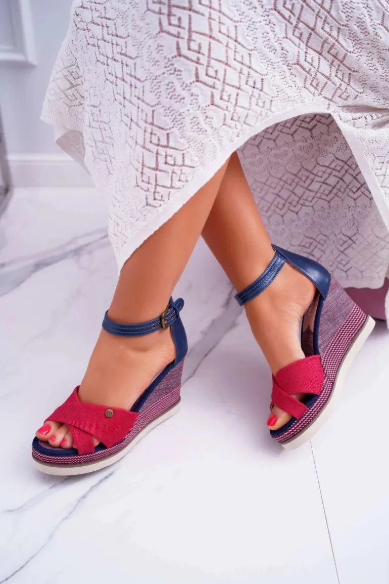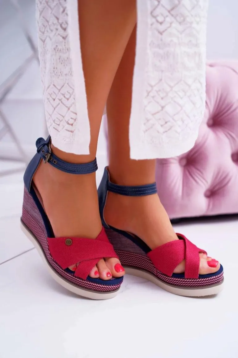 Sandały Damskie Na Koturnie Jeans Czerwone DoThis!