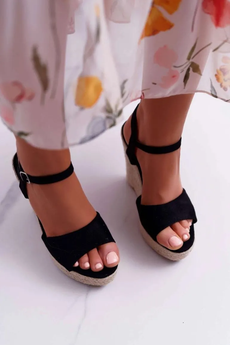 Sandały Damskie Na Koturnie Lniane Czarne Girenn