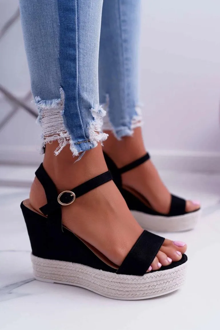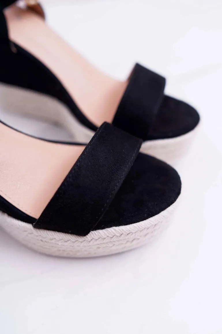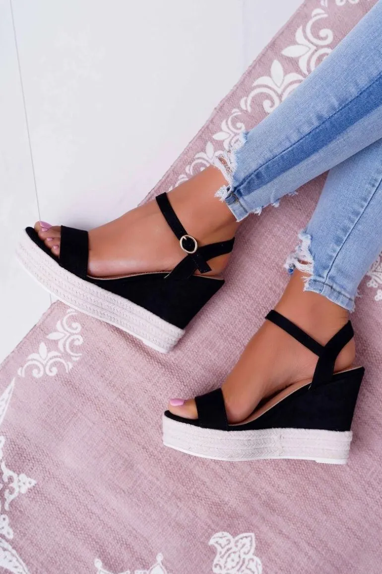 Sandały Damskie Na Koturnie Lniane Czarne Liviana