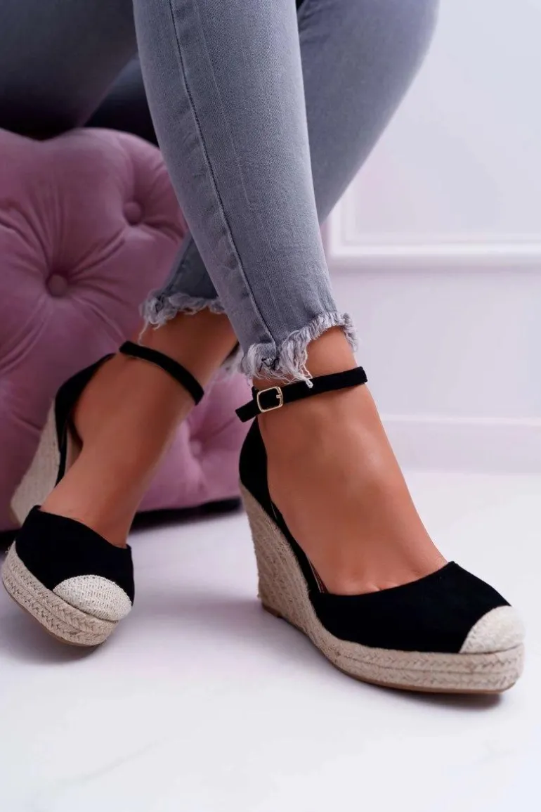 Sandały Damskie Na Koturnie Lniane Czarne Tammaris