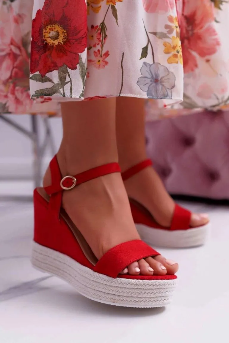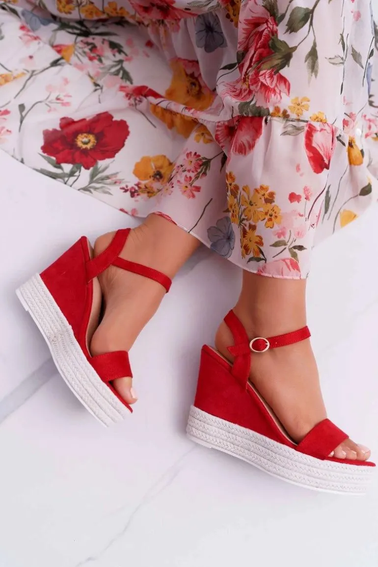 Sandały Damskie Na Koturnie Lniane Czerwone Liviana