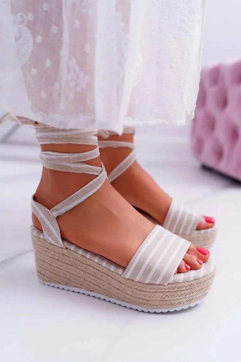 Sandały Damskie Na Koturnie Platformie Lniane Wiązane Beżowe Jolyn