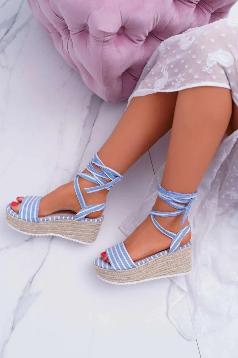 Sandały Damskie Na Koturnie Platformie Lniane Wiązane Błękitne Jolyn