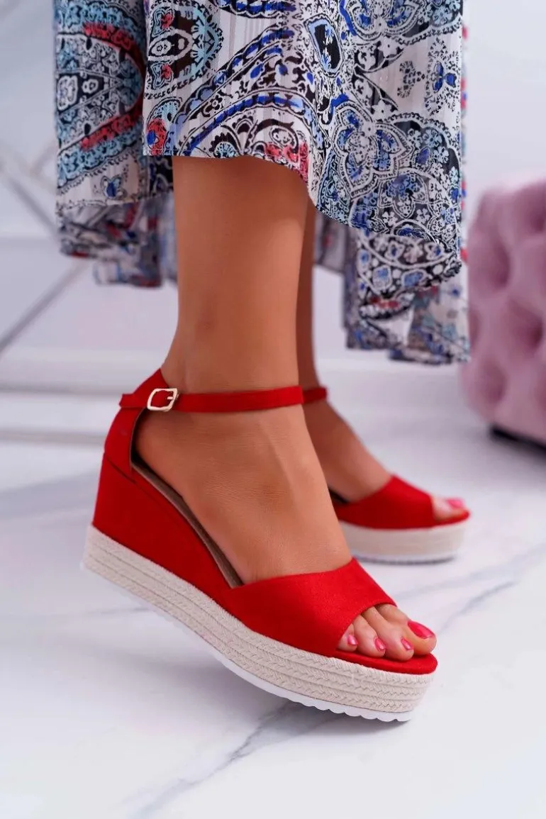 Sandały Damskie Na Koturnie Platformie Zamszowe Czerwone Delima