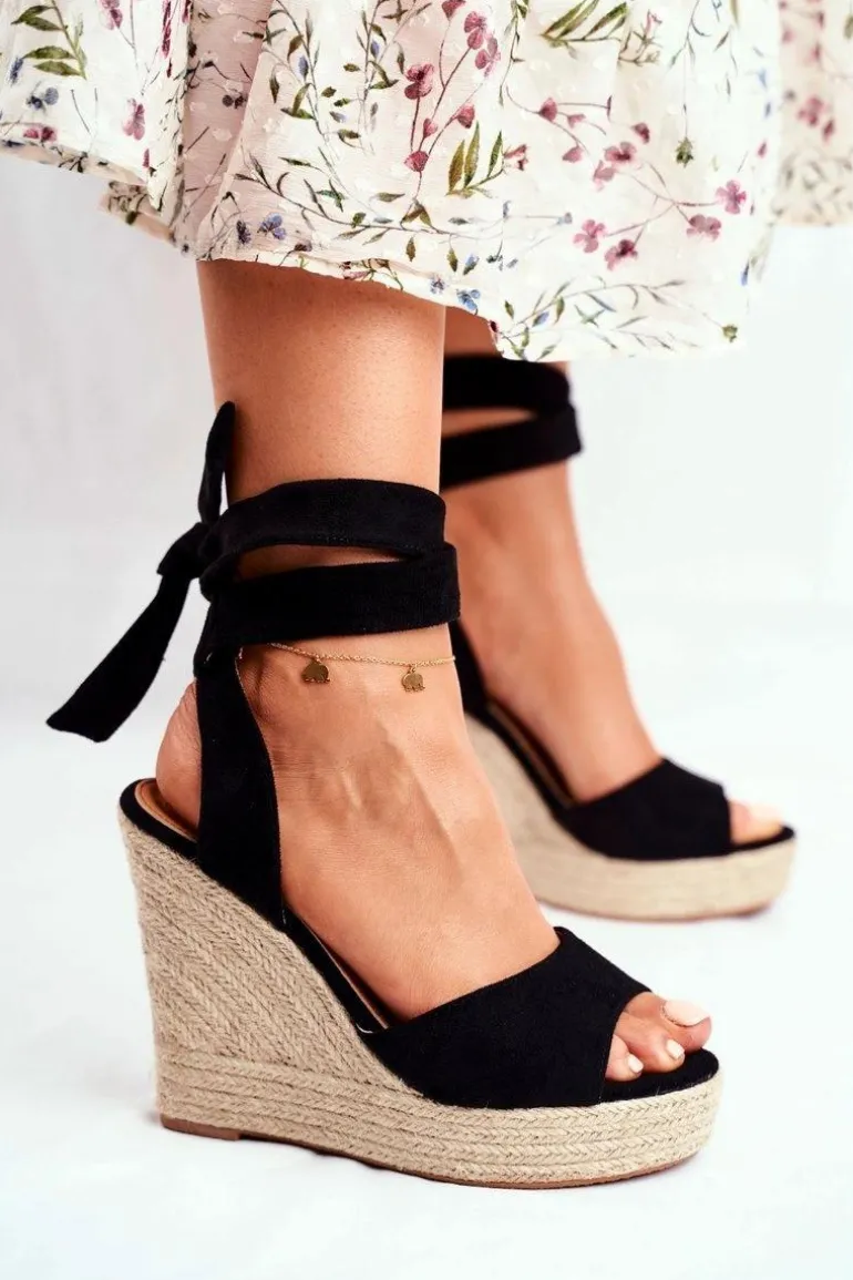 Sandały Damskie Na Koturnie Wiązane Czarne Belleza