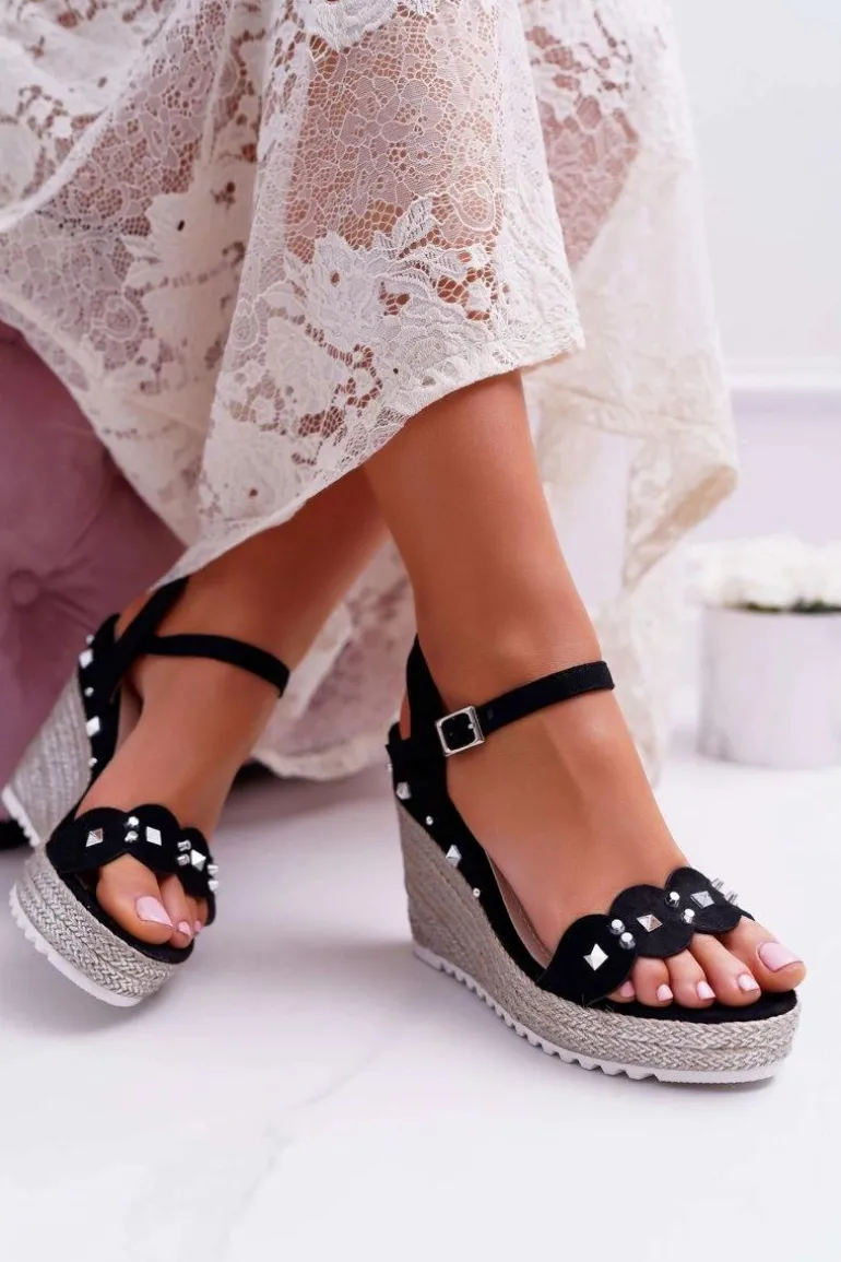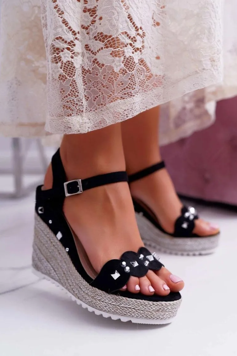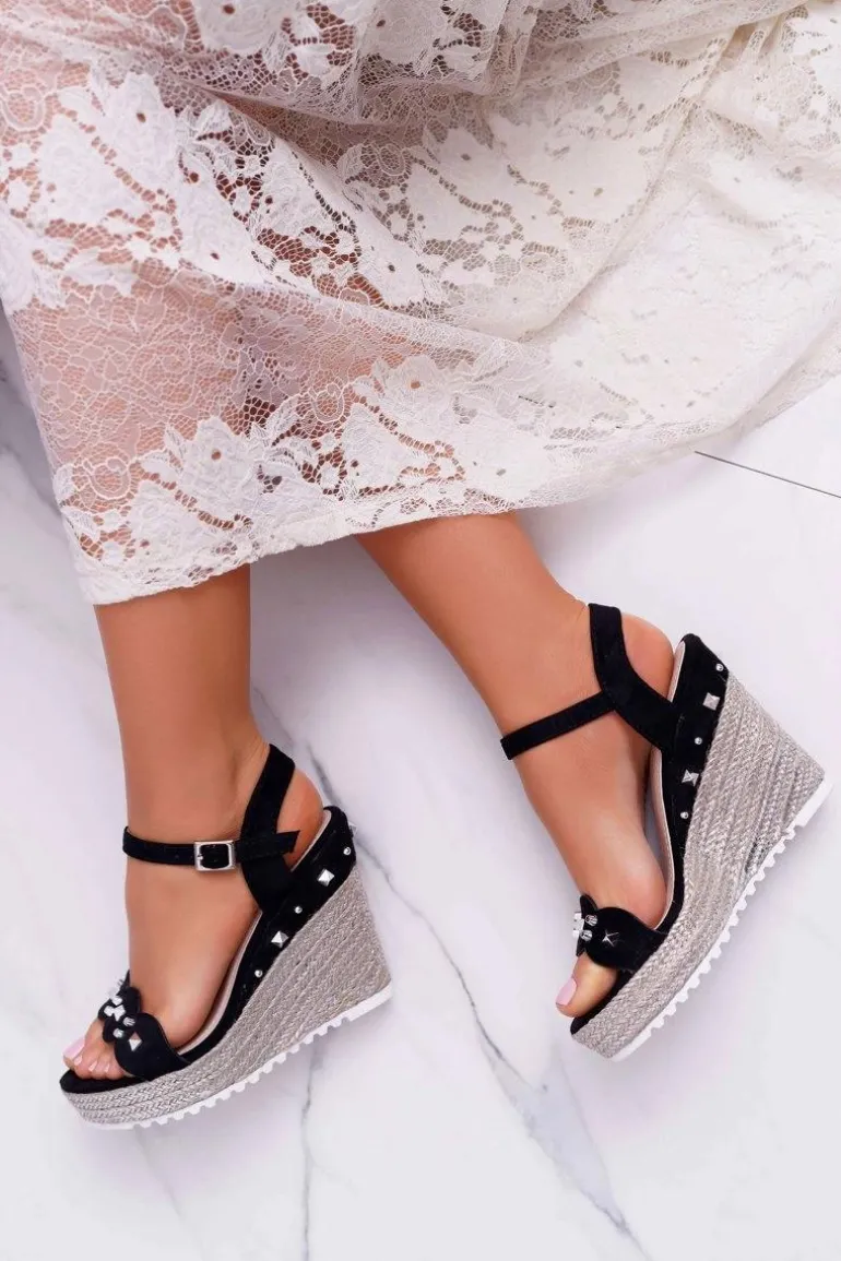Sandały Damskie Na Koturnie Z Dżetami Ćwiekami Czarne Alenni