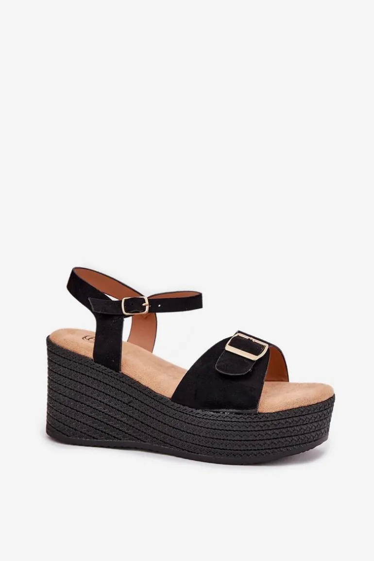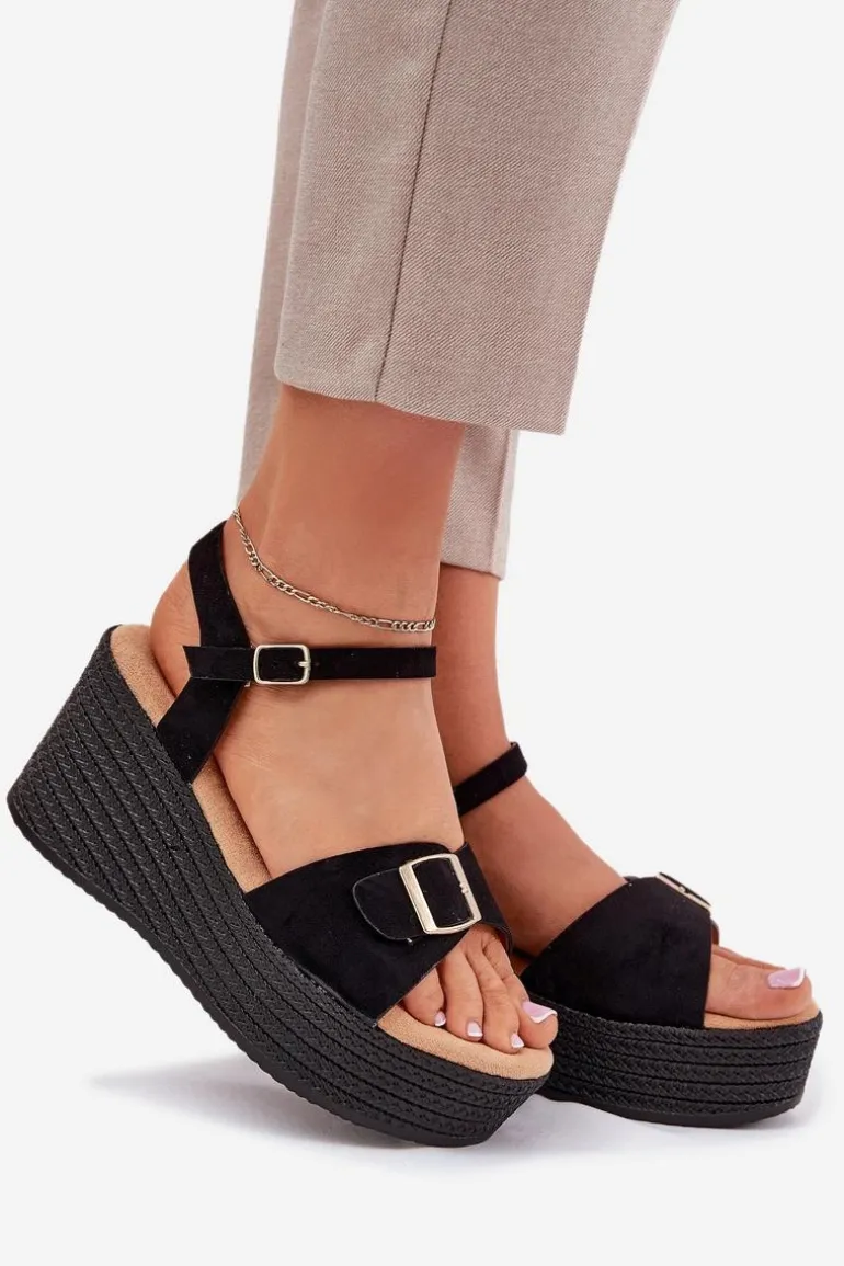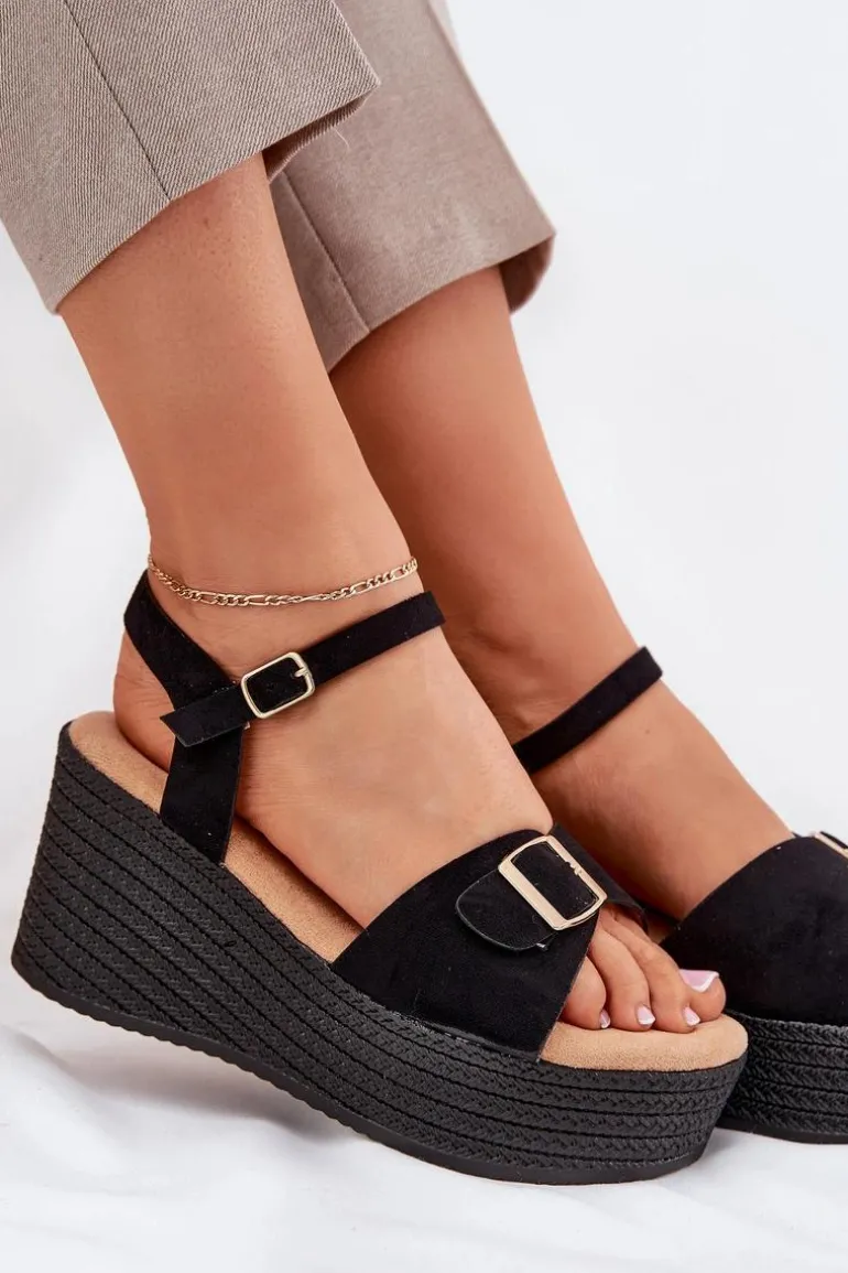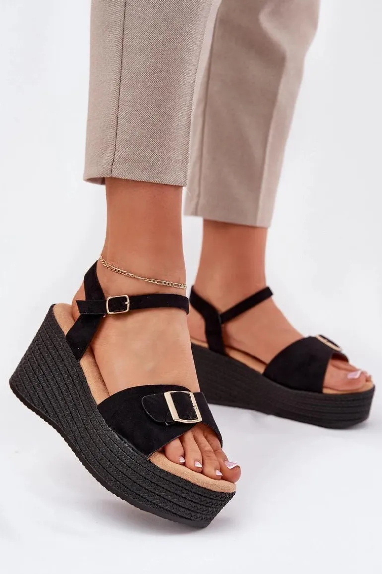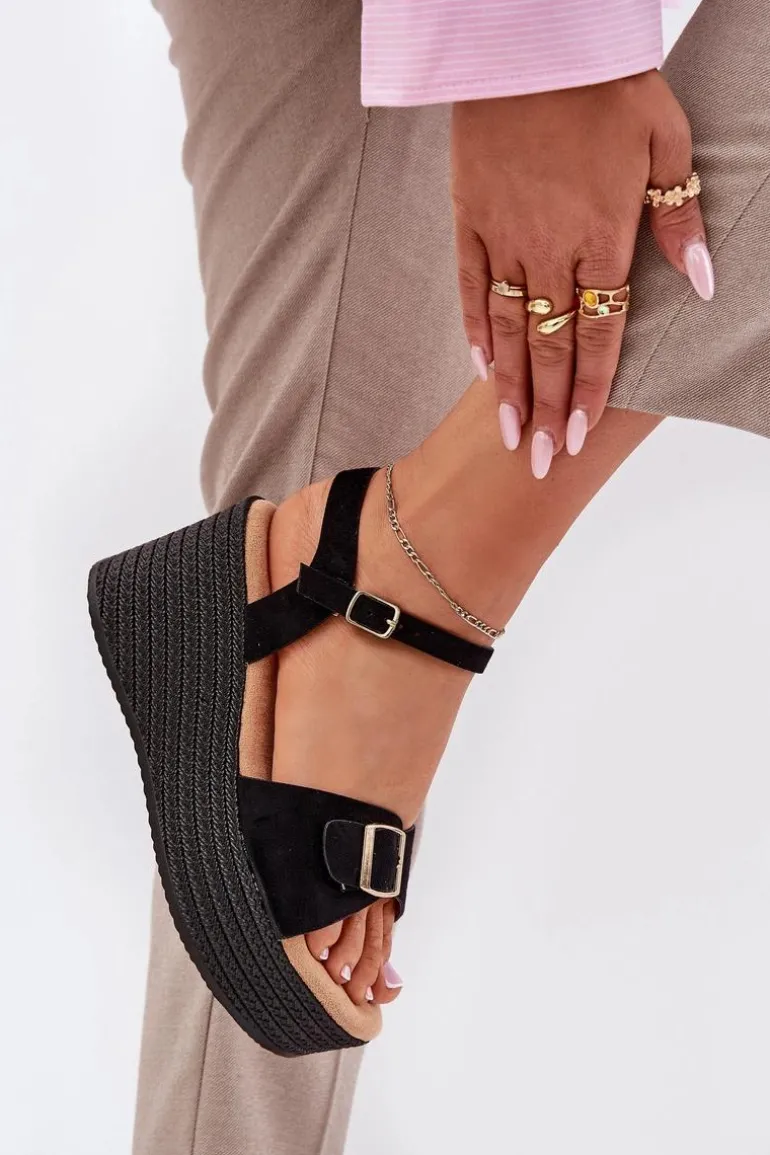 Damskie sandały wykonane z eko zamszu. Osadzone na koturnie i platformie z imitacją plecionki, zapewniają wygodę oraz stabilność przez cały dzień. Z przodu znajdują się ozdobna klamra, która dodaje im unikalnego charakteru. Model zapinany na sprzączkę umożliwia idealne dopasowanie do stopy, a miękka wkładka gwarantuje komfort. Te sandały będą doskonałym uzupełnieniem letnich stylizacji. Przy wyborze rozmiaru prosimy sugerować się tabelą rozmiarów.