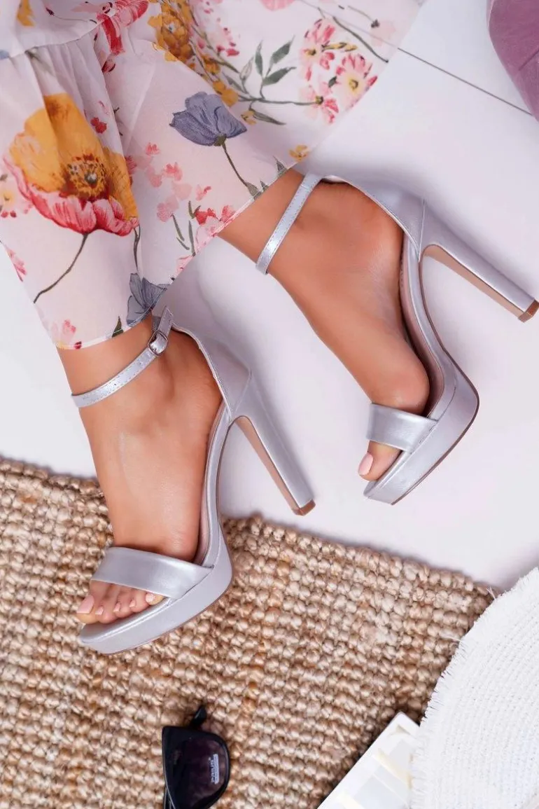 Sandały Damskie Na Obcasie Platformie Srebrne Ellania