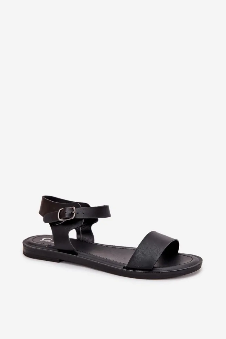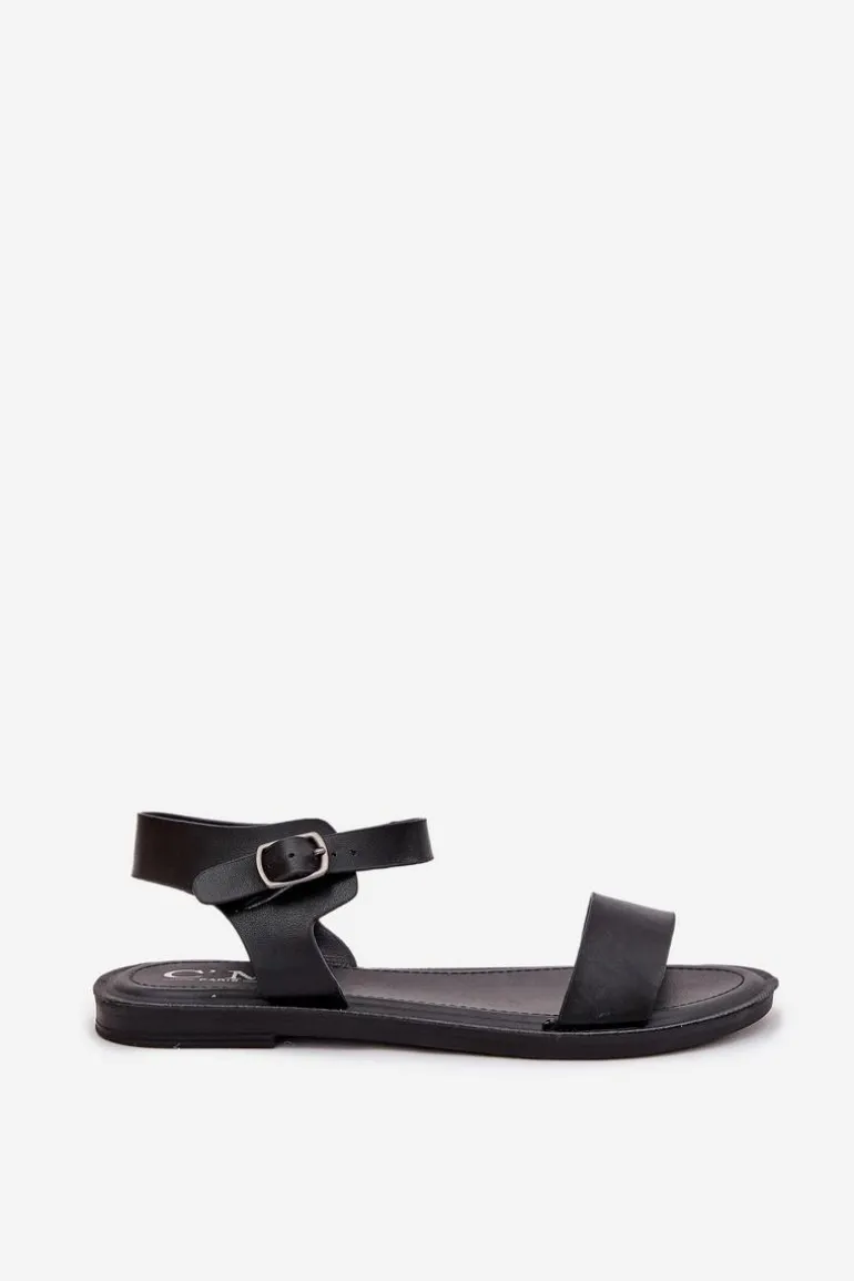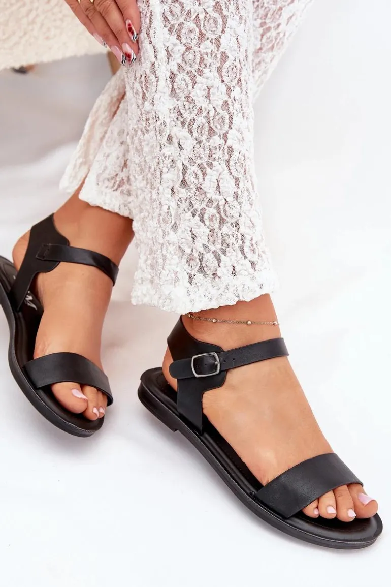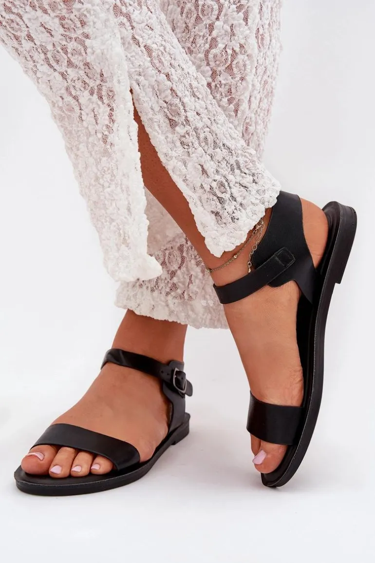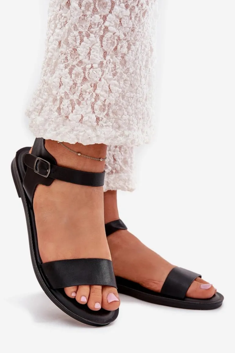Sandały Damskie Na Płaskim Obcasie Eko Skórzane Czarne Kivara
