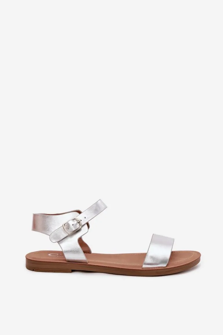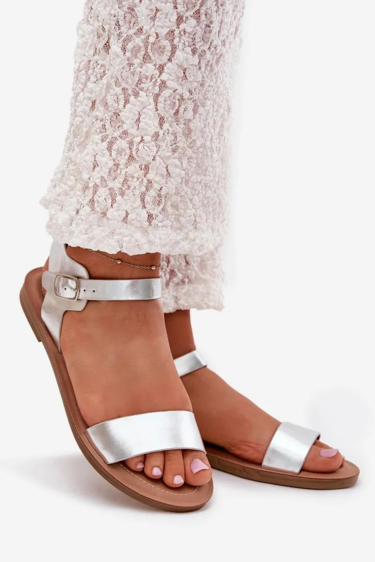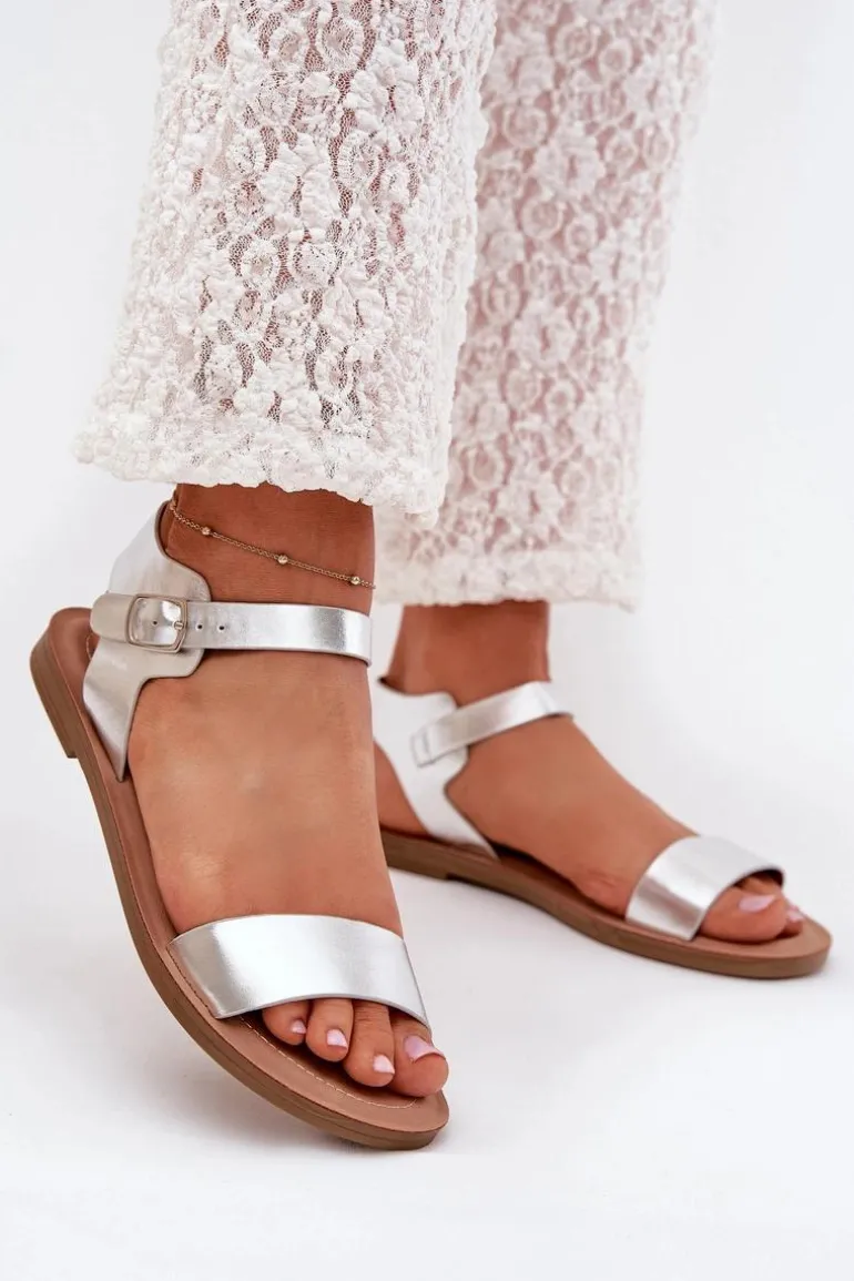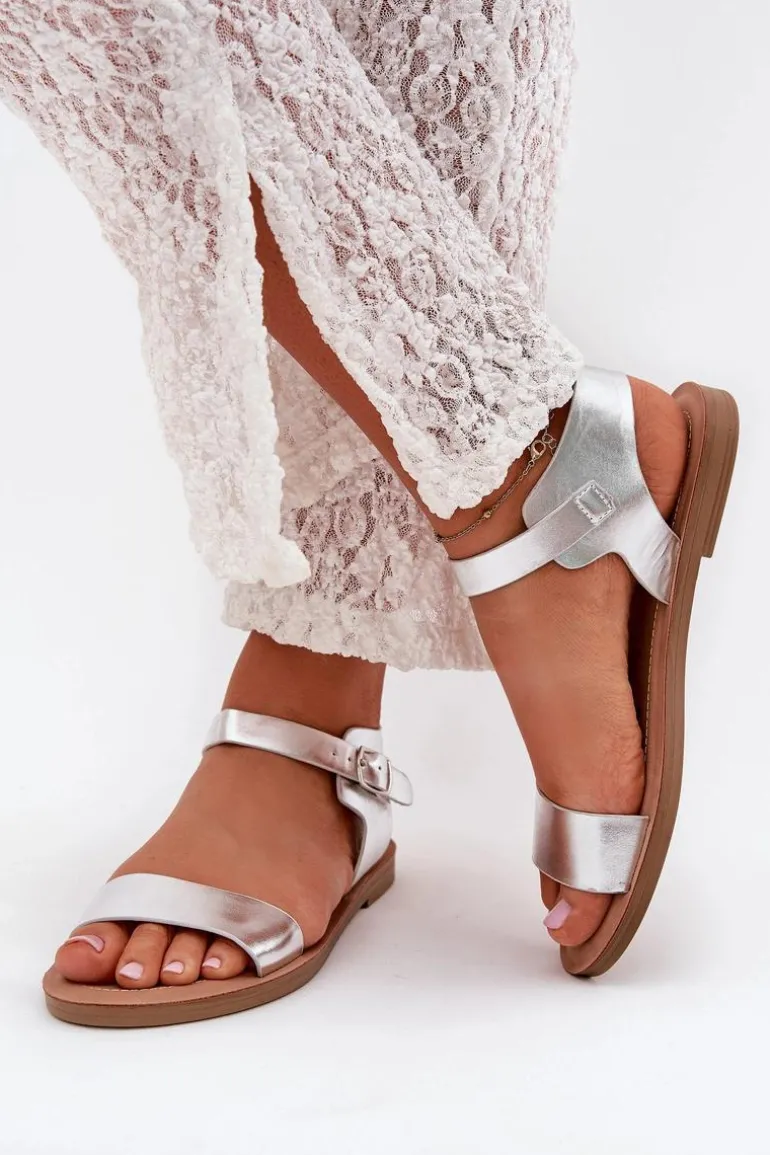 Sandały Damskie Na Płaskim Obcasie Eko Skórzane Srebrne Kivara