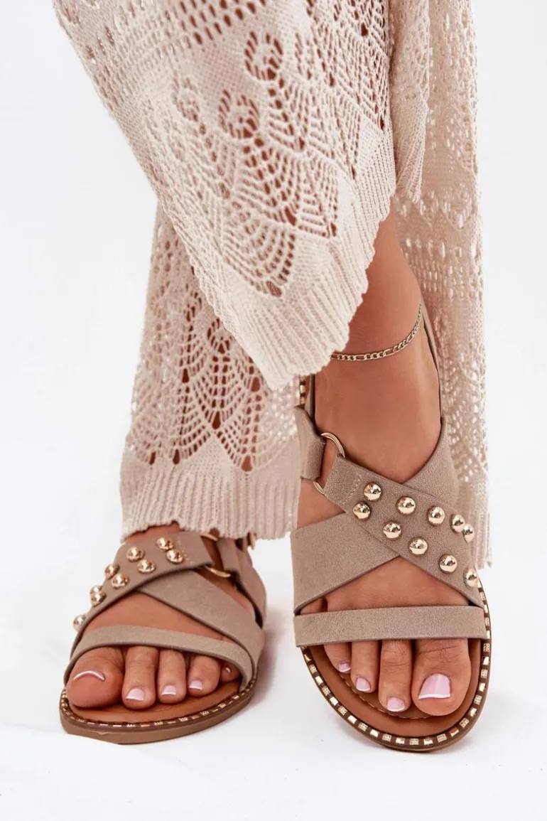 Sandały Damskie Na Płaskim Obcasie Ze Złotymi Ćwiekami Beżowe Zanira