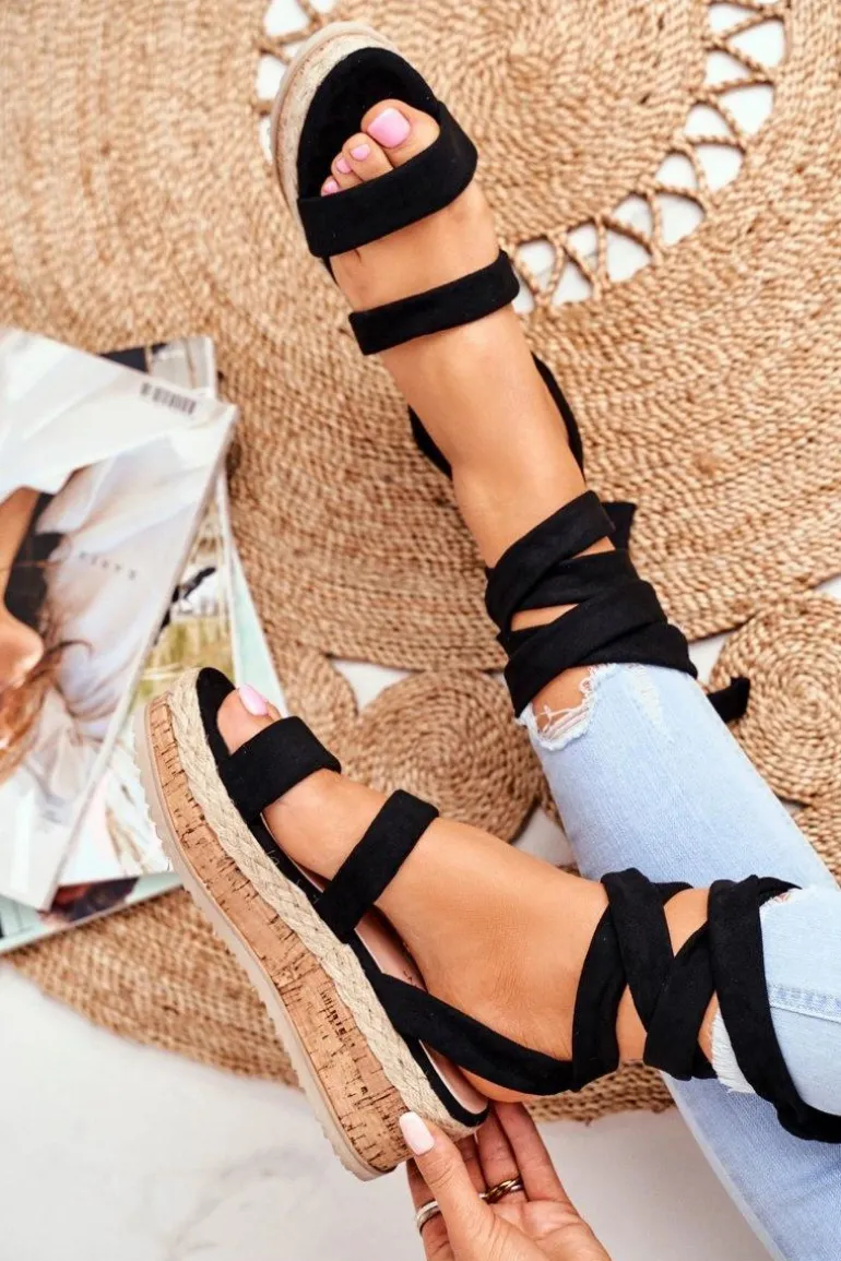 Sandały Damskie Na Platformie Wiązane Czarne La Favorite