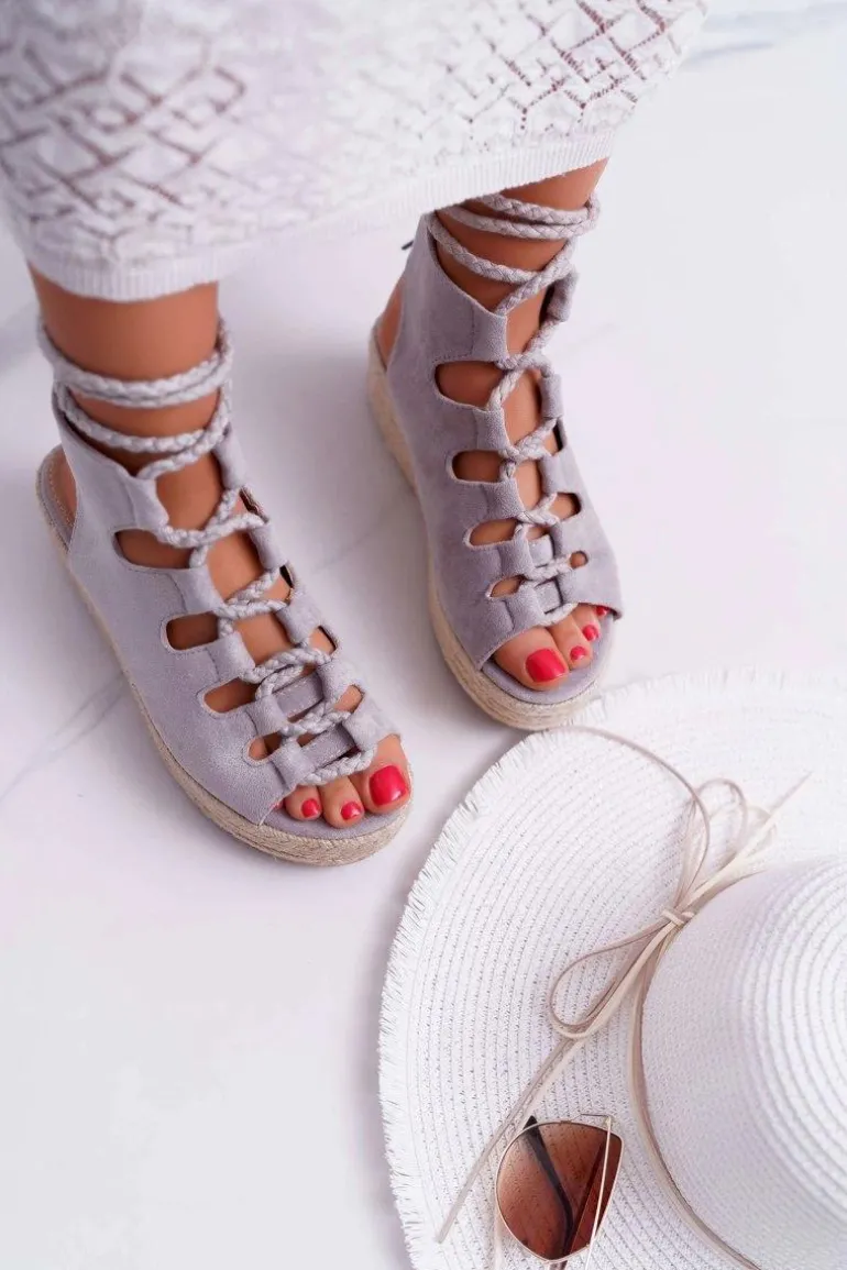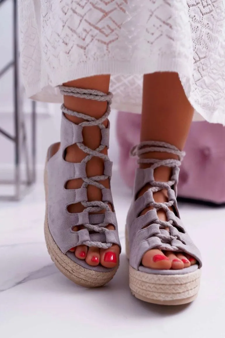 Sandały Damskie Na Platformie Z Espadrylem Sznurowane Szare Grand