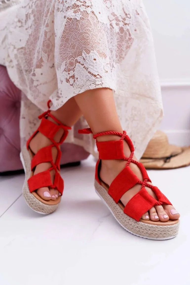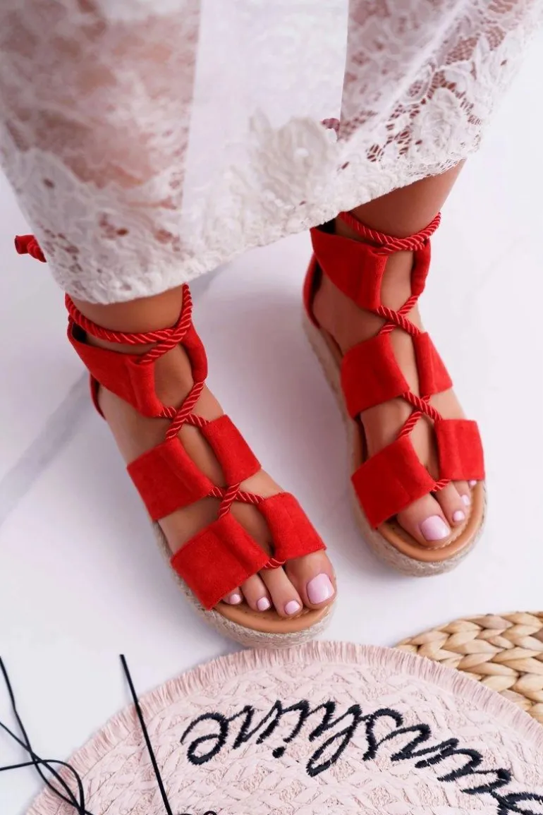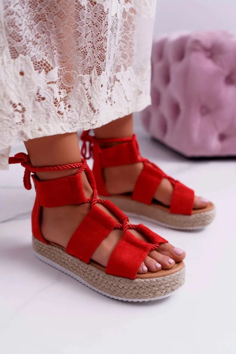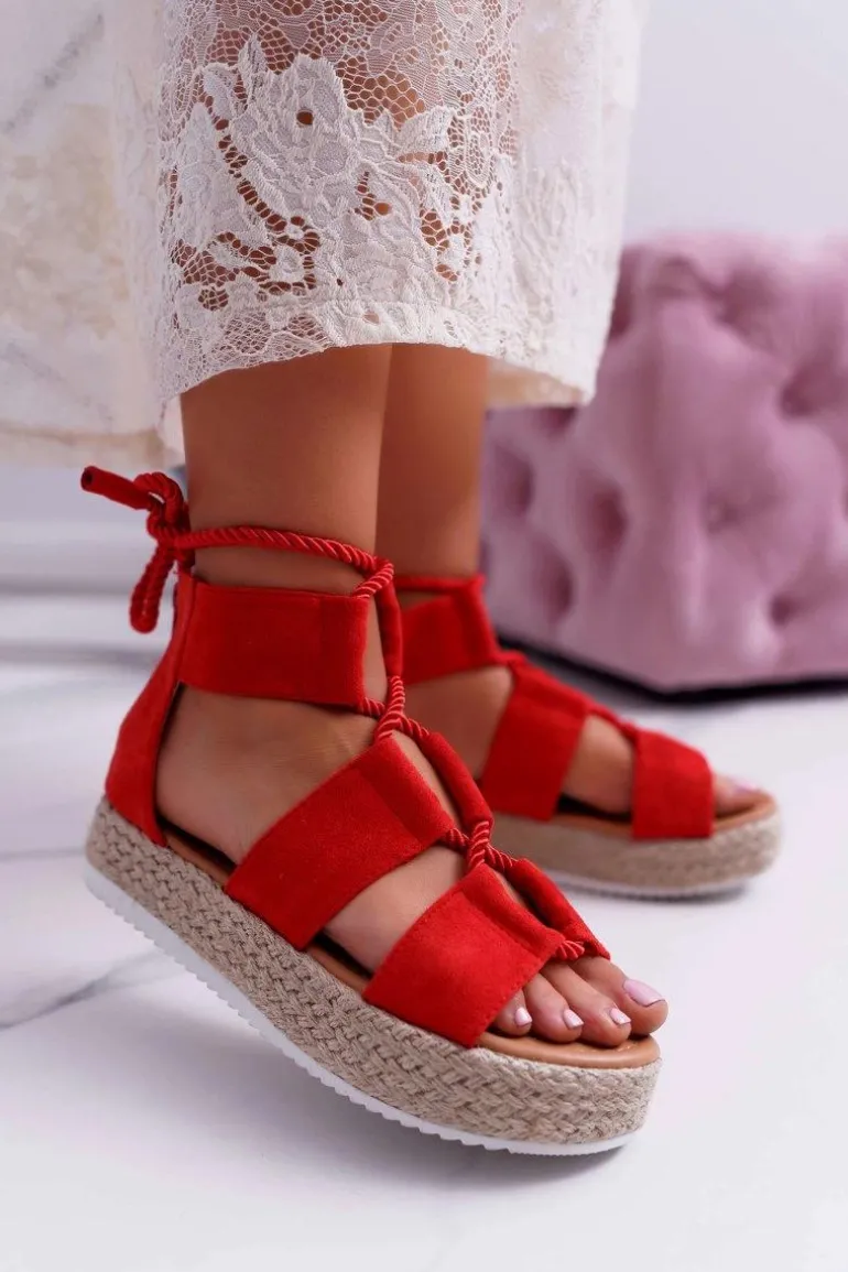 Sandały Damskie na Platformie Zamszowe Czerwone Ergola