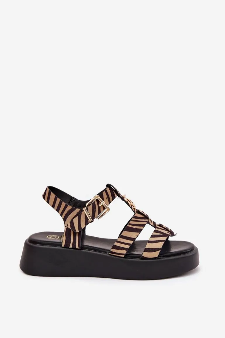 Sandały Damskie Na Platformie Ze Złotym Detalem Zebra Beżowo-Czarne Fevire