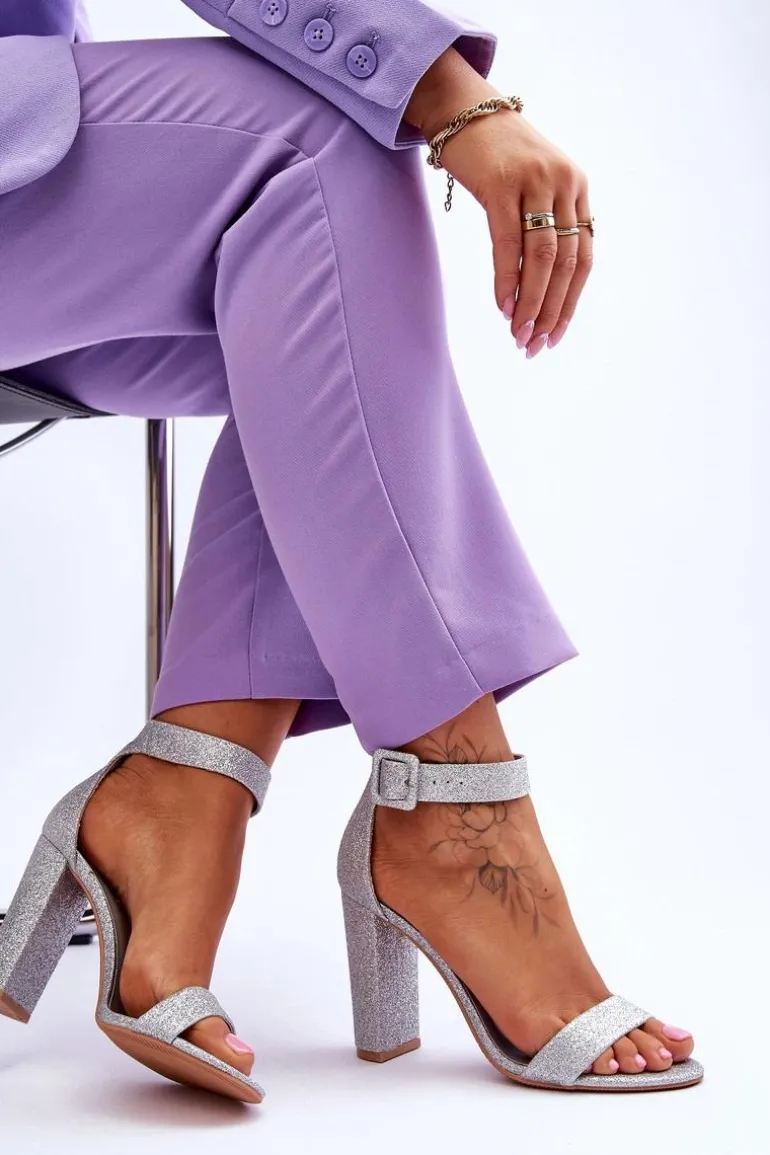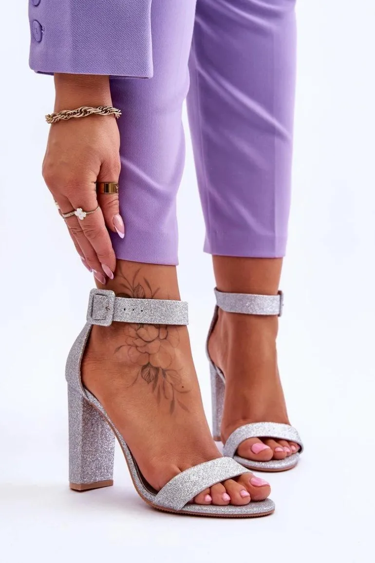 Sandały Damskie Na Słupku Brokat Srebrne Joalice