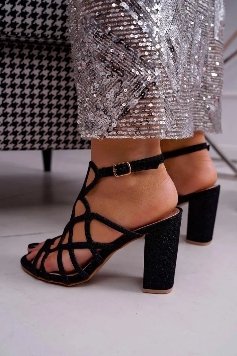 Sandały Damskie Na Słupku Brokatowe Czarne Gete